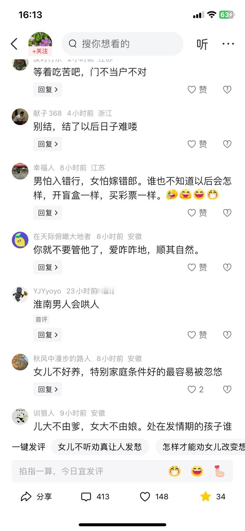 淮南小伙就怎了,网友为何不看好人家这对年轻人! 一女子女儿24岁,现在上海工作,上大学期间谈了一个安徽淮南小伙,现在两个小年轻想结婚,男方城里没房,也没汽车,也没积蓄,老家有一栋二层老房子。女儿自己放出话来不要彩礼,也不与家人沟通,父母发愁这事怎办。 大部分网友们的意见,不要干涉年轻人的婚姻,女大不由娘,顺其自然,但是大家不看好,认为门不当户不对,等着吃苦吧! 其实吧,能嫁出去是好事,总比三十多岁不嫁当剩女好吧!你说了?