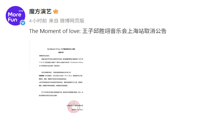 王子上海演出取消 30日,魔方演艺发布公告,宣布王子邱胜翊原定于11月16日举办的上海场音乐会取消。此前,范姜彥丰曾公开点名王子插足他与粿粿的婚姻。