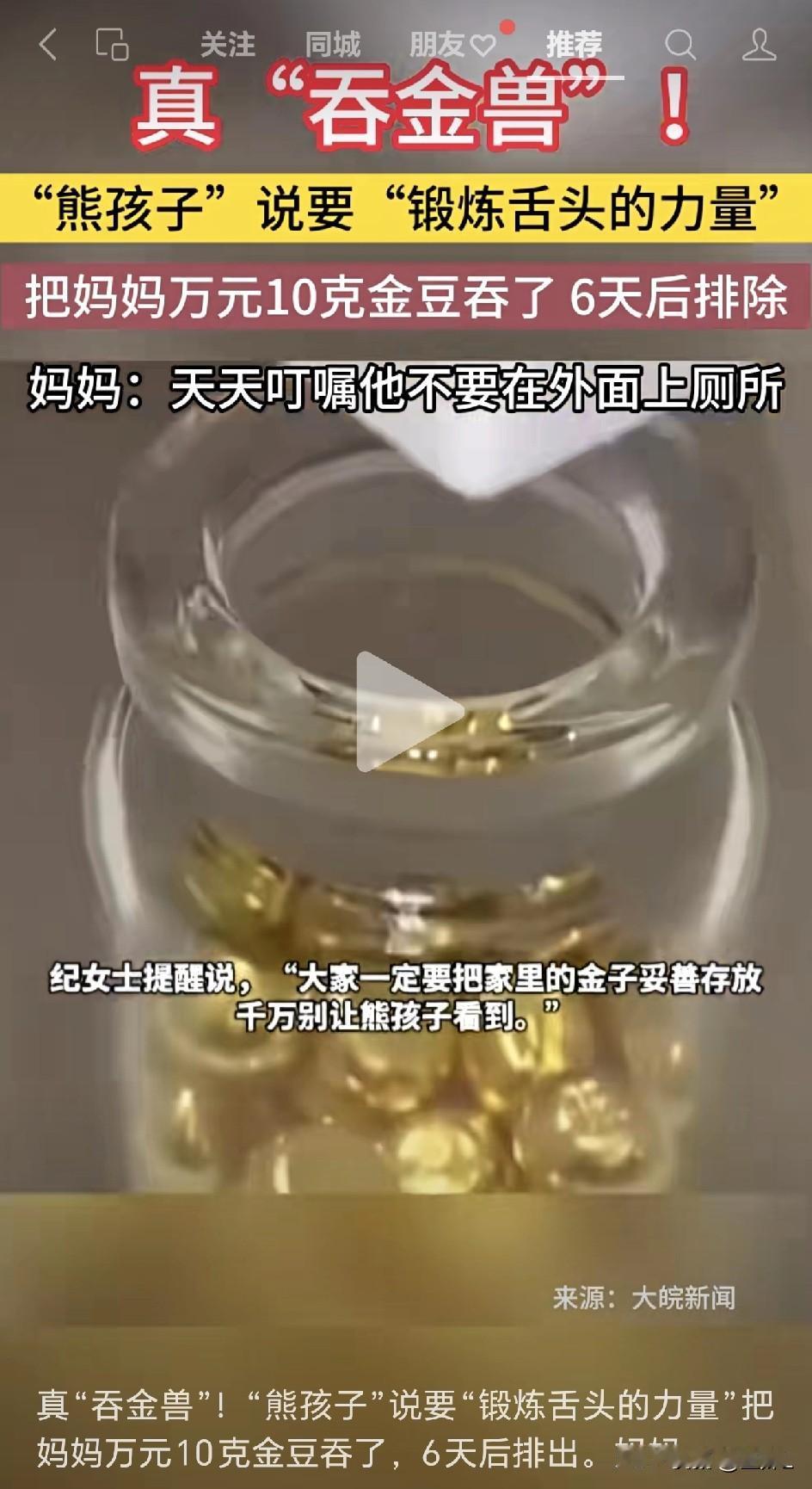 真·“吞金兽”!熊孩子为练舌功吞下10克金豆,妈妈叮嘱不准在外面大便,守候五天“淘金”成功。 10月22日,江苏昆山,纪女士网购的10克金豆子到货了,11岁的儿子稀罕的不得了,把金豆子拿到自己屋里玩。 正在阳台洗衣服的纪女士,不大会就听到儿子叫她,“妈妈你快过来,我要死了,我把金子给吞了!” 起初,纪女士以为儿子在开玩笑,当知道儿子为了要锻炼舌头的力量,而真的把这个10克的金豆子给吞下去了时,纪女士一时哭笑不得。 这下,真成了彻彻底底的“吞金兽”了。 纪女士想到自己的侄女曾经吞过一枚硬币,后来去医院,医生看过后说问题不大,自己能拉出来。 又上网查了查,看大家说金子也能拉出来,所以就没有太在意。只是嘱咐儿子不能在外面拉大便,因为这个大便太金贵。 结果五天过去,“吞金兽”拉了两次大便,都没有找到金豆的影子。 纪女士不放心,带孩子去医院检查,显示胃内有异物,但因为孩子目前无腹痛、呕吐等症状,所以医生建议还是等孩子自行排出。 幸运的是,上午去的医院下午就拉出来了,花费万元买来的金豆子终于失而复得。 纪女士把相关内容发布到社交平台,引起50多万人围观,她提醒,“大家一定要把家里的金子妥善存放,千万别让熊孩子看到。” 真是没有熊孩子不敢干的事!真是名副其实的“吞金兽”! 信息来源于新桂平,侵联删!