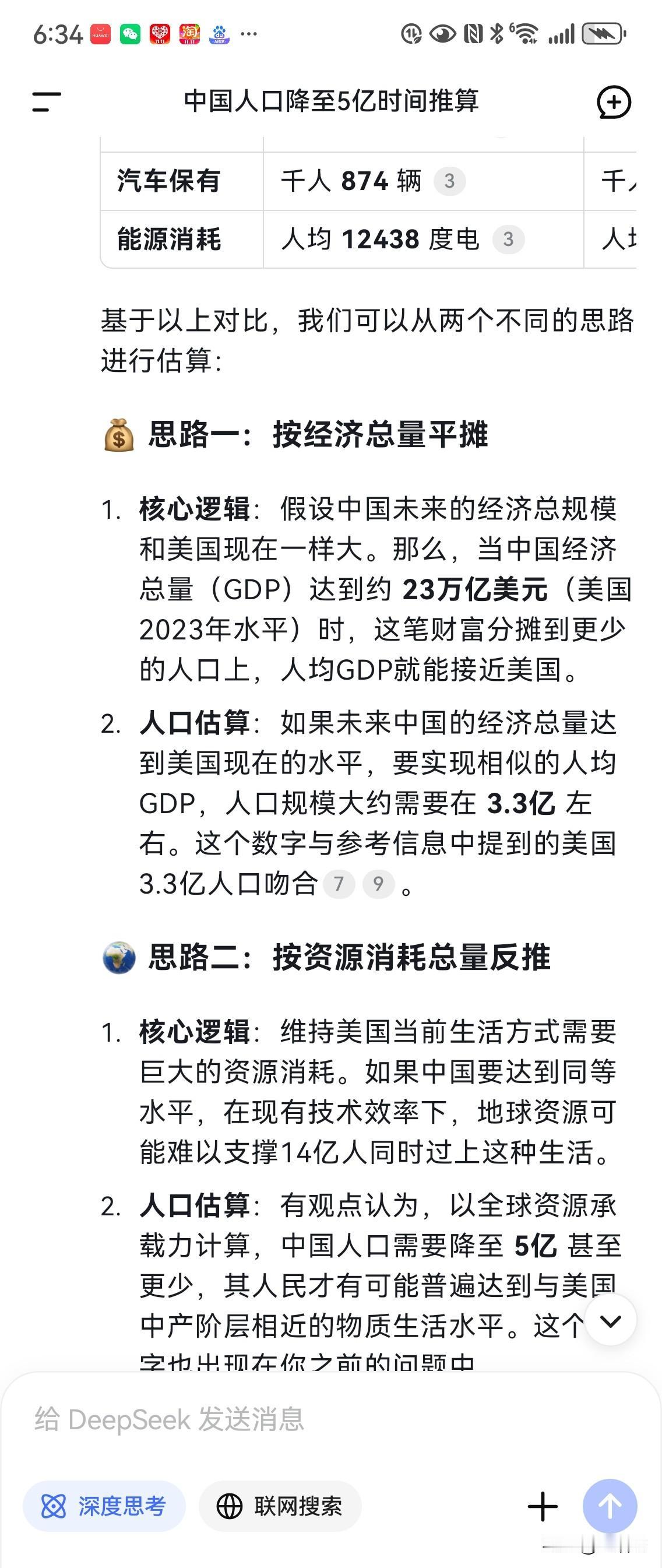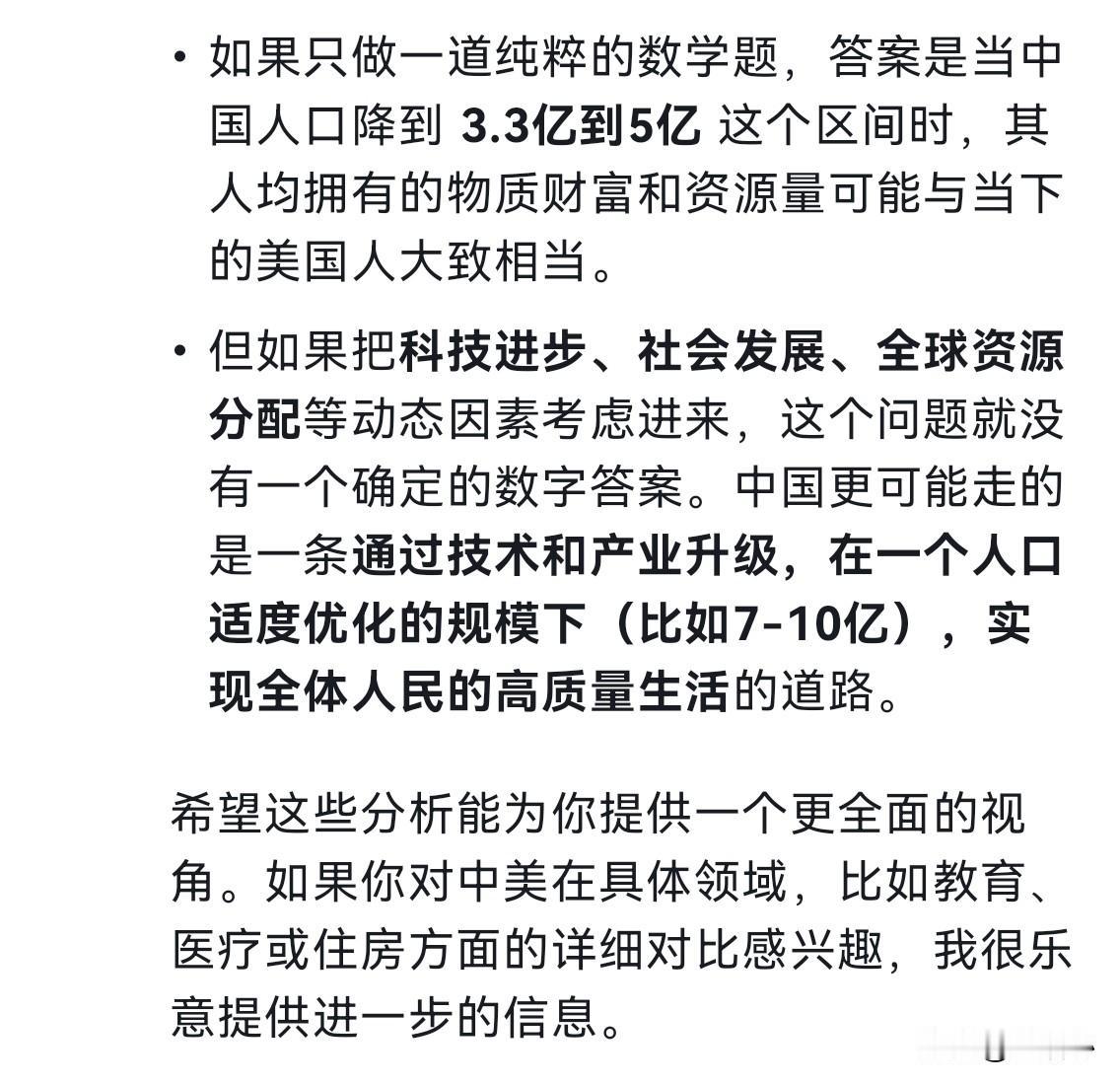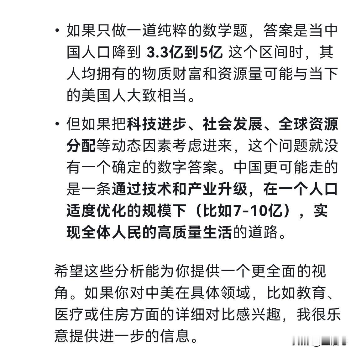 DeepSeek告诉你一个残酷的事实:中国大概需要一个世纪才能够赶上美国人现有的生活水平。 即当中国的人口在5亿左右,算上科技进步的水平,其人均拥有的物质财富和资源量与目前美国人相当。 而中国的人口规模需要一个世纪才能够骤减到5亿左右。 所以目前生育水平骤然下降,是不是社会进步的一种表现呢?