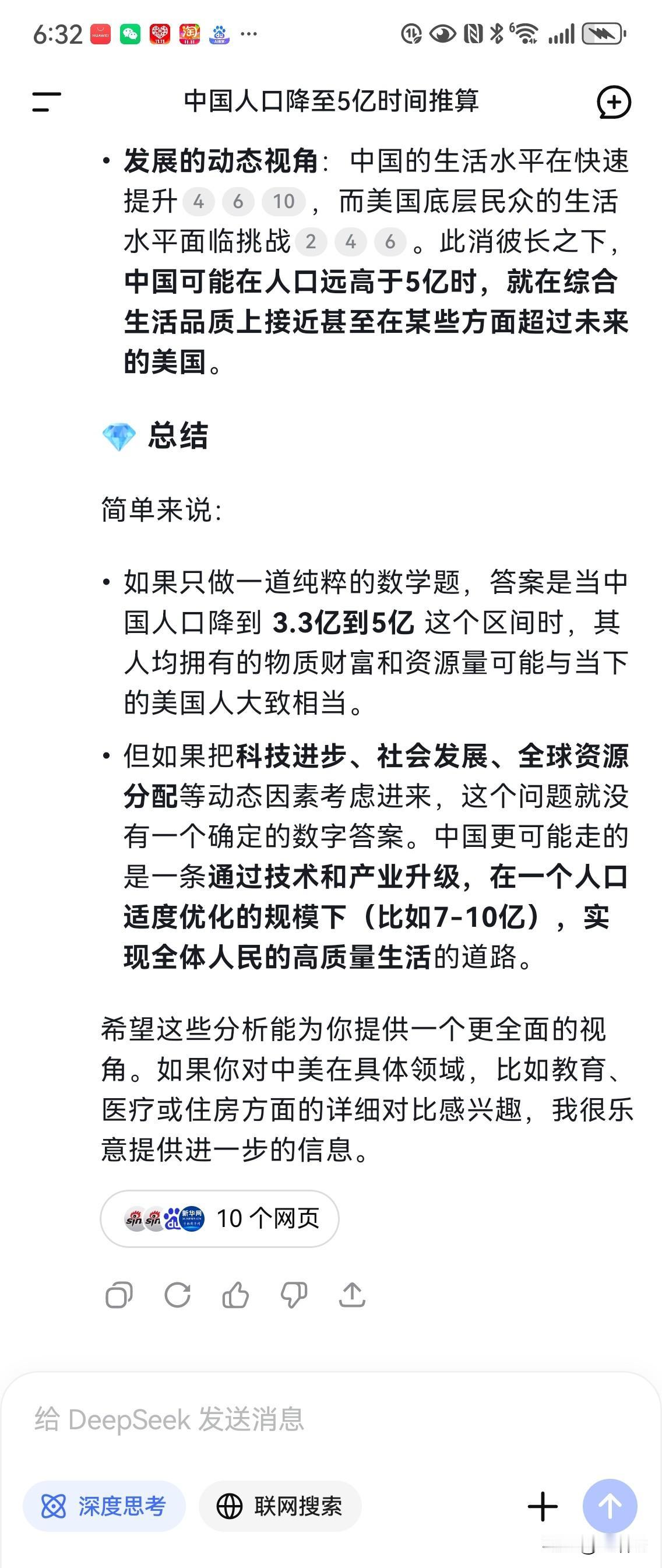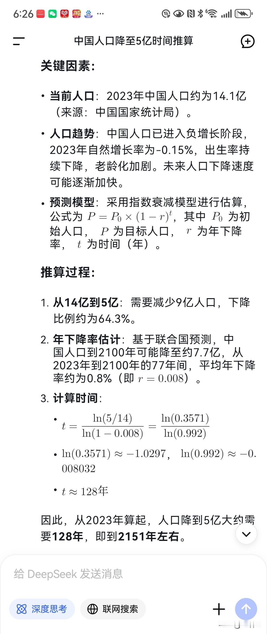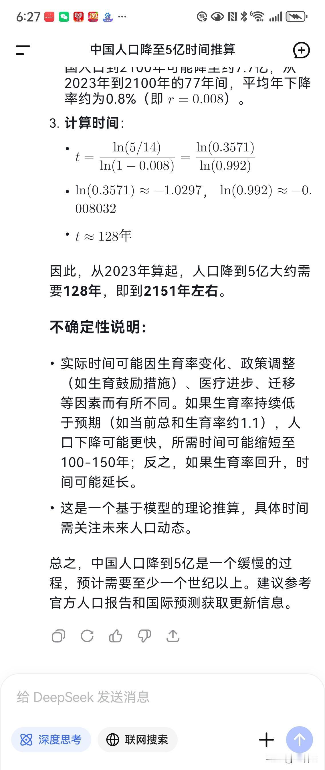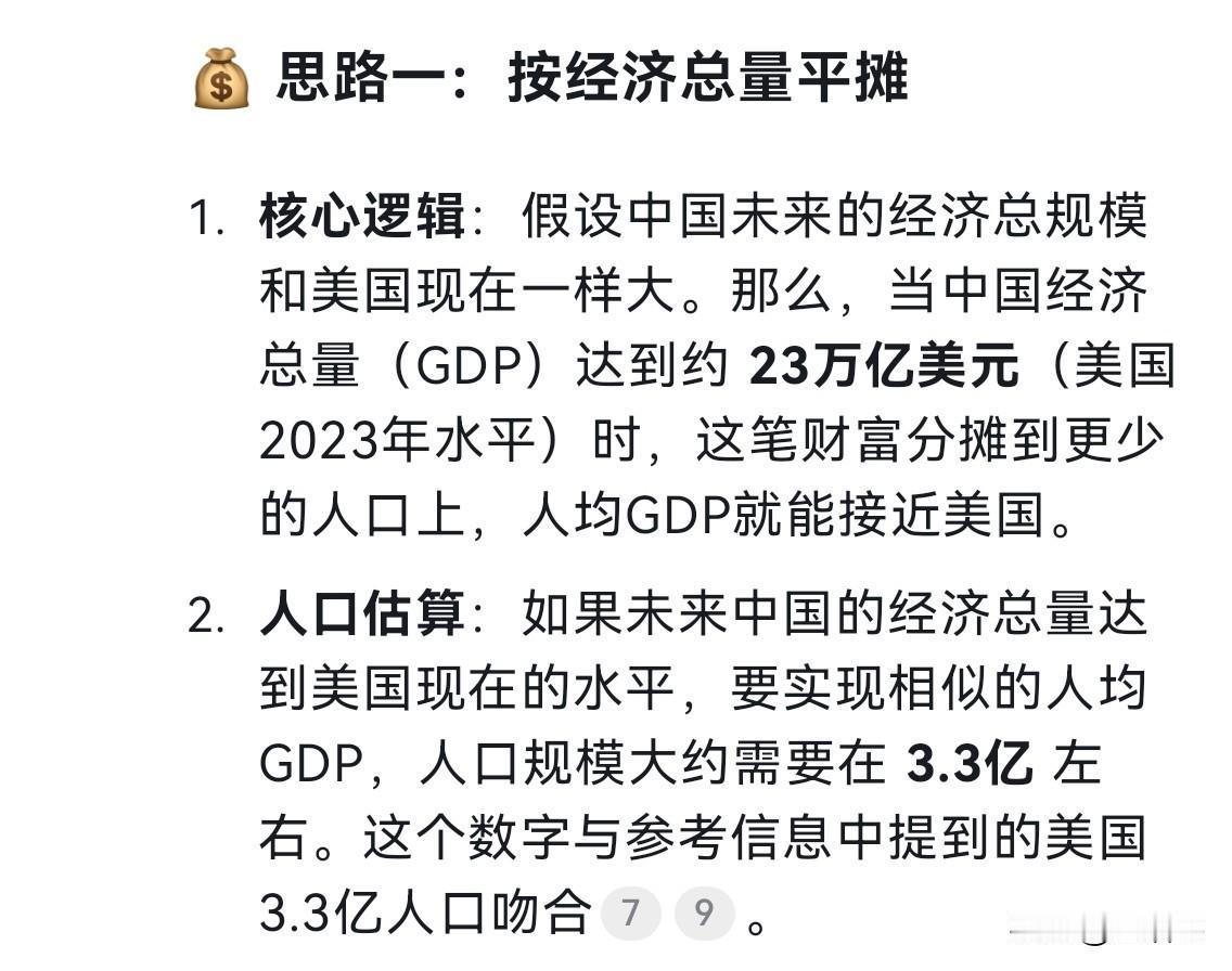 DeepSeek告诉你一个残酷的事实:中国大概需要一个世纪才能够赶上美国人现有的生活水平。 即当中国的人口在5亿左右,算上科技进步的水平,其人均拥有的物质财富和资源量与目前美国人相当。 而中国的人口规模需要一个世纪才能够骤减到5亿左右。 所以目前生育水平骤然下降,是不是社会进步的一种表现呢?