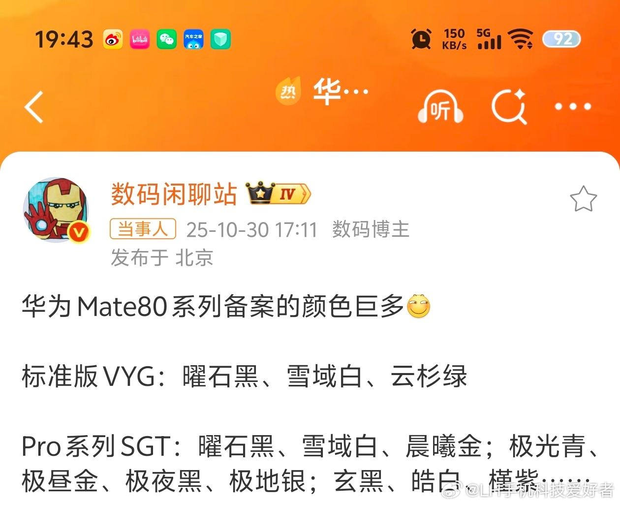 华为Mate80系列颜色曝光华为Mate80系列颜色曝光,听说这次选择很多。标准版目前爆料三个颜色,华为Mate80 Pro系列多的数不过来。不知是否会一起上市。