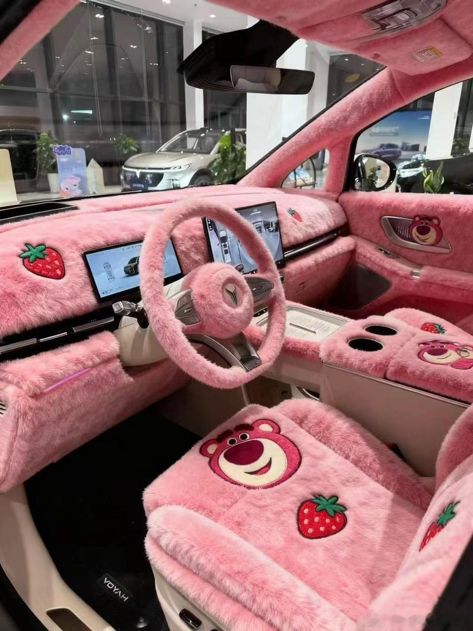 整个岚图梦想家都被毛茸茸的草莓熊“占领”了,连空气都弥漫着甜蜜的气息!从方向盘到座椅,再到门板,每一处都被软绵绵的粉色覆盖。坐进去就像置身于草莓味的云朵中,治愈感十足,少女心瞬间被填满!