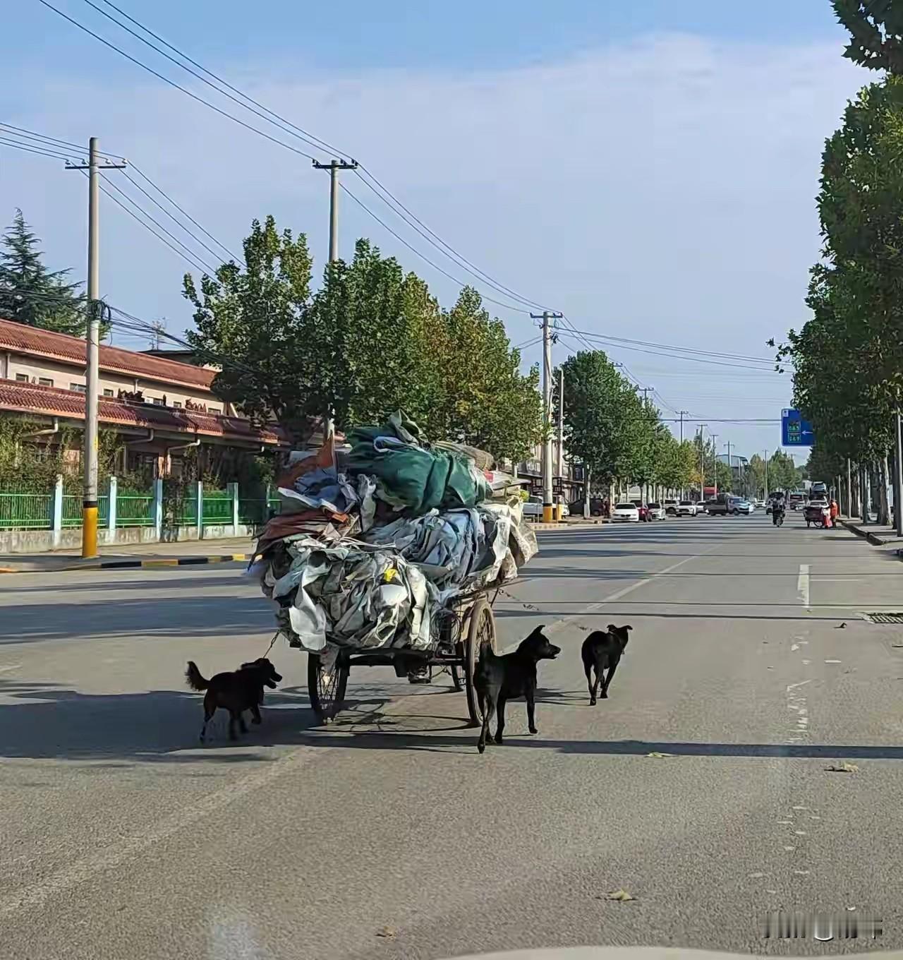 一位老人骑着装满废品的三轮车,车上系着三只黑色狗狗,狗狗也在奋力的帮他拉着,这一幕真的令人动容,这三只狗狗是他收养的,虽然老人经济条件不好,可他却从不亏待狗狗,自己吃什么狗狗就吃什么。 三只狗狗也非常聪明懂事,经常帮助老人拉车,收拾废品,甚至捡瓶子。它们懂得感恩,也很听老人的话。这就是最好的回报。相信老人和它们一定会好好的生活下去。