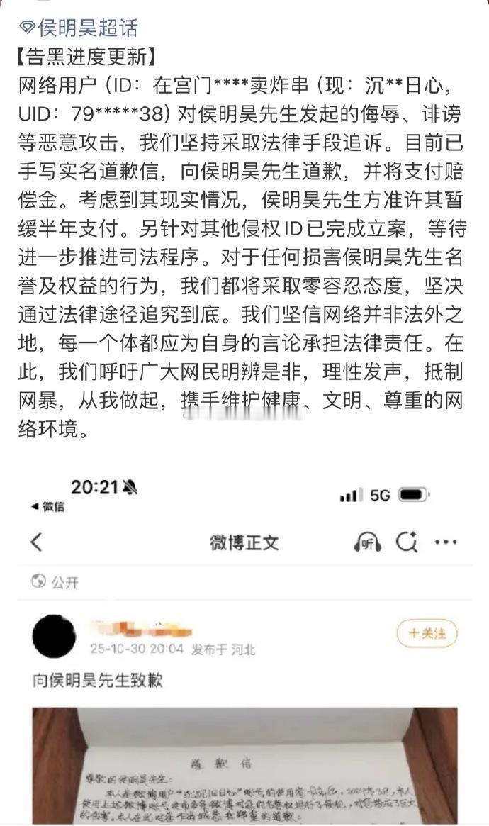 侯明昊告黑成功,对方手写道歉信并赔偿,允许暂缓半年支付,小猫哥人帅心善