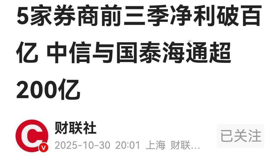 财联社统计,截止今天21:00,有47家券商公布了前三季度业绩,5家盈利破百亿,中信与国泰海通盈利逾200亿。整体上无一家吃亏,乃史上最为壮丽的一页。可是,本轮行情似乎与所谓的“牛市旗手”没啥关系,让按老黄历埋伏券商股的投资者感到十分离奇。 究其原因至少有三,一曰大科技才是本轮牛市的主线,咋换话题也很难把券商这个平台和护盘工具当成主题;二曰压券商股就是为让牛儿走得慢些,五年十年牛市不能五月十月就寿命终结;三曰“9.24行情”满周岁后挣钱不易,四季度自营盘、成交量等因素决定了券商股业绩难以为继。 所以,券商股再也回不到“牛市旗手”的过去,想重仓券商股发财的投资者,其实喝口汤都不易。未来发掘潜力股做高低切,仍要聚焦新质生产力。