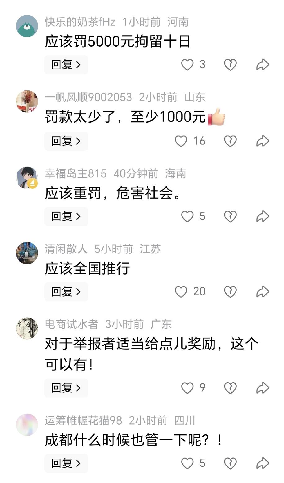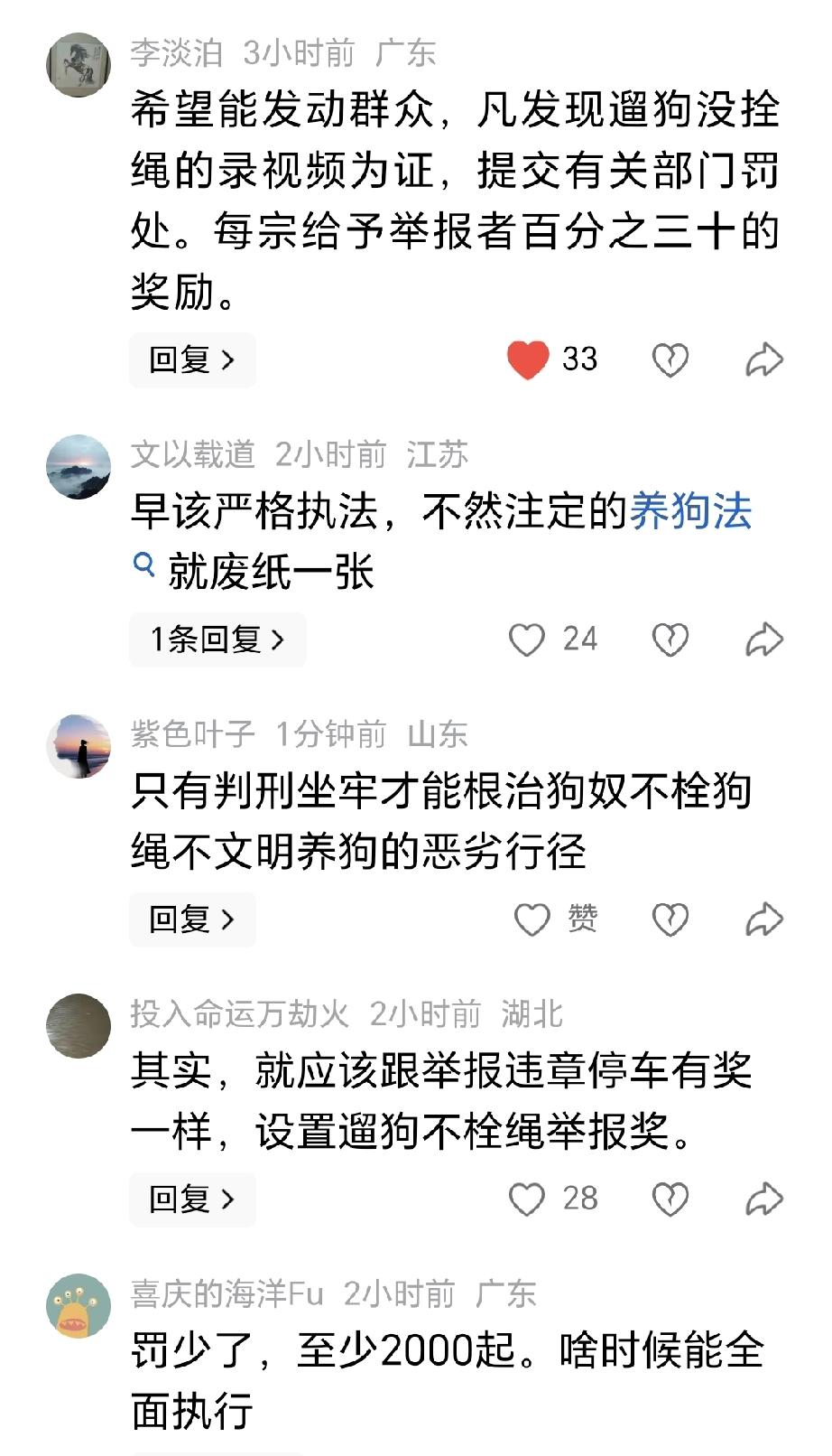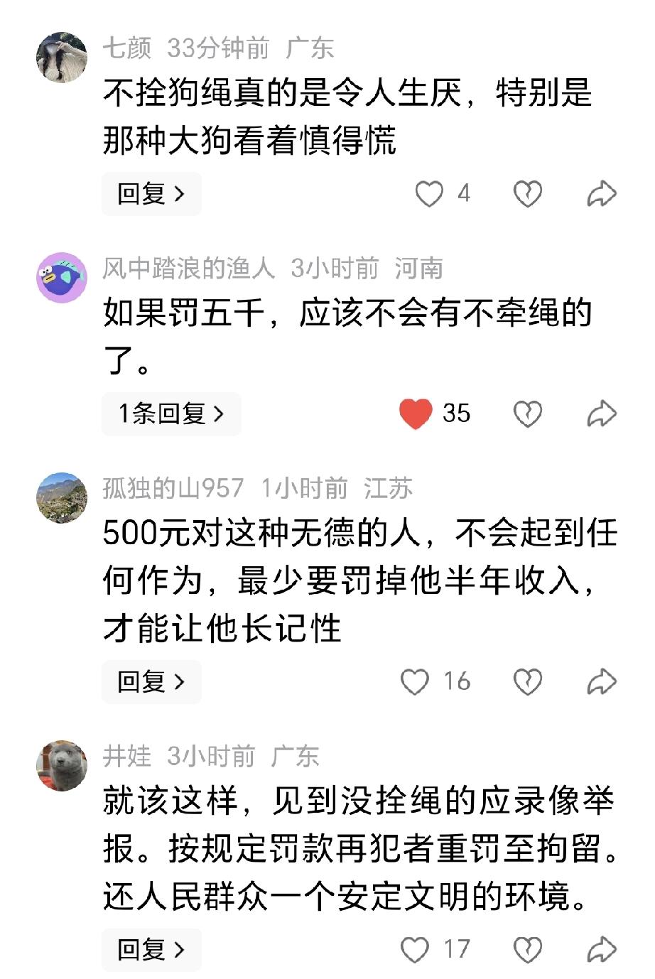 遛狗不牵绳真的就管不了了吗? 刚在头条看到一篇深圳新闻网发的消息,说是深圳一居民因为遛狗不牵绳,被相关部门罚款500元。 看这条消息下的评论,清一色是支持的,可见对遛狗不拴绳,公众的恼怒已到了何种程度。 当下全国的城市,恐怕都会有关于养犬的相关规定,这些规定中也一定会有针对遛狗不牵绳的处罚措施,但遛狗不牵绳的现象,却在几乎每个城市都普遍存在着,使得相关的管理规定形同虚设,公众对不文明的养犬行为怨声载道。 难道真就没有办法治理这遛狗不牵绳的行为了吗?非耶! 在这条消息下方的评论区,有网友就建议对遛狗不牵绳者,发现者可以拍照举报,就像举报机动车违章违停那样的,将遛狗不牵绳者的不文明行为,将拍的照片或视频发到相应的举报平台,然后由相关部门进行落实并严格处罚。 若真的能实行这样的方法,虽然不能说会杜绝遛狗不牵绳的不文明行为,但肯定会极大地减少此类行为的。这就要看相关部门是否有这样的决心了!