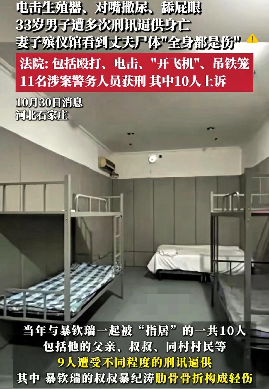 11名办案人员获刑! 刑讯逼供致死案,最该警醒的是什么? 河北33岁男子暴某被邻居诬告涉黑,办案人员竟在宾馆用铁椅、电棍、手摇电话等工具刑讯逼供,12天后他不幸离世。 最终11名办案人员被判刑,诬告的邻居也被公诉,可这代价实在太沉重。 办案者本应是正义的守护者,却用暴力突破法律底线,这种行为比诬告更伤人心。 法律明确禁止刑讯逼供,可有人偏偏知法犯法,说到底是权力观扭曲,把审讯当成“立威”的手段。 不管暴某后续是否被查出其他问题,刑讯逼供致死都是不可饶恕的错。司法公正容不得半点暴力,只有守住程序正义,才能避免冤假错案。 你觉得该如何杜绝这类执法乱象?来评论区说说你的想法。