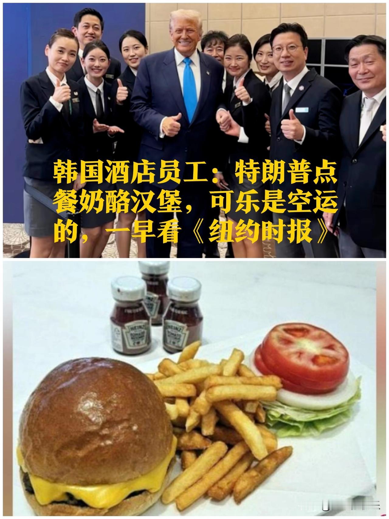 韩国酒店员工:特朗普点餐奶酪汉堡,可乐是空运的,一早要看《纽约时报》 据外媒报道美国总统特朗普10月29日到访韩国,出席在韩国举行的亚太经合组织(APEC)峰会。 新加坡《联合早报》网站10月30日报道,韩国庆州希尔顿酒店消息人士透露,特朗普29日约下午4时30分抵达酒店八楼客房后,第一时间通过客房服务点餐,指定要奶酪汉堡,并特别要求使用美国奶酪及额外番茄酱。 酒店一名员工说,特朗普没有点常配的可乐,但把芝士汉堡、炸薯条与番茄酱全都吃了,显得“十分满意”。除了这次客房服务,特朗普没有提出其他要求。至于他偏好的健怡可乐(Diet Coke),由于当地难以采购,美国方面通过专机空运至韩国。 酒店应白宫方面的要求,在特朗普所住客房准备应季水果,包括阳光玫瑰葡萄、凤梨、苹果、柿子、哈密瓜与李子,以满足他住宿期间的饮食需求。在休息约两小时后,特朗普出席由韩国总统李在明在酒店大宴会厅主办的首脑特别晚宴。席间,他称赞“食物味道非常好”,并主动要求与酒店宴会工作人员合影留念。 据了解,特朗普在酒店沐浴后称赞“水质很好”,并询问是否为软水或净化水。酒店方面回应说,所使用的是温泉水。 此外,特朗普还要求次日清晨7时将《华盛顿邮报》与《纽约时报》等美国主流报纸送达客房。早餐由白宫团队预先准备并送入客房。 酒店方面说,“总统在客房内的餐食细节我们无从掌握,白宫方面提供的所有物品在离开前已全数带走。” 韩国《朝鲜日报》报道,特朗普入住的八楼房间通常是留给贵宾的。他房间的窗户还加装了防弹玻璃。