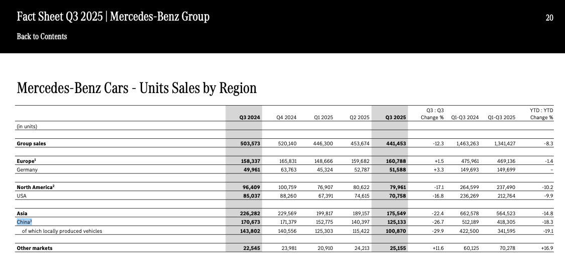 奔驰发布Q3“成绩单”: 主力市场崩了,全球销量降12%,中国区更惨,收入跌23%,只有北美、欧洲勉强撑着。 投资者心凉,每股收益大跌32%,分红快说再见。 最迷惑的是,研发烧了265亿,比特斯拉还多78亿,钱却没烧出科技亮点,全耗在流程和内耗上。 船大难掉头,钱多没花对。