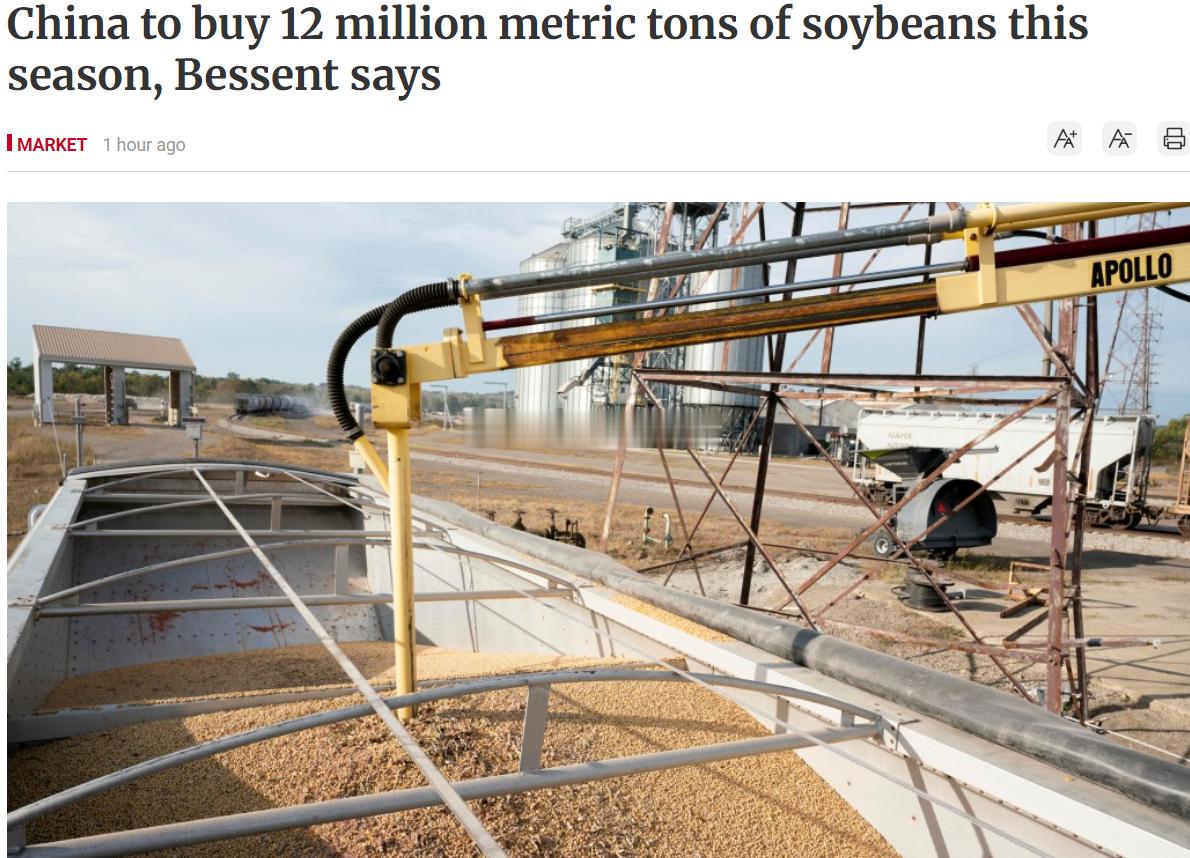 10月30日,美国财政部长贝森特在福克斯商业频道(Fox Business)节目中表示,中国已同意本季度到明年1月购买1200万吨大豆,并在未来三年内每年至少购买2500万吨。今年4月,美国失去了对华大豆最大供应国地位,巴西取而代之。当时,美国对华大豆出口额几乎减半,至6.194亿美元。巴西迅速夺回领先地位,出口量增长近四倍。此后,美国5月份对华大豆出口量意外增长20%,但随后开始下滑:4月至6月,美国是中国第二大大豆出口国,7月位列第三,8月位居第四,仅向中国出口了价值1.018亿美元的大豆。9月,中国未从美国进口大豆,从去年同期的170万吨降至零。巴西继续保持出口领先地位,出口额达49亿美元,比8月份增长6%。俄罗斯在中国大豆进口中所占份额不足1%。美方加征24%关税继续暂停一年