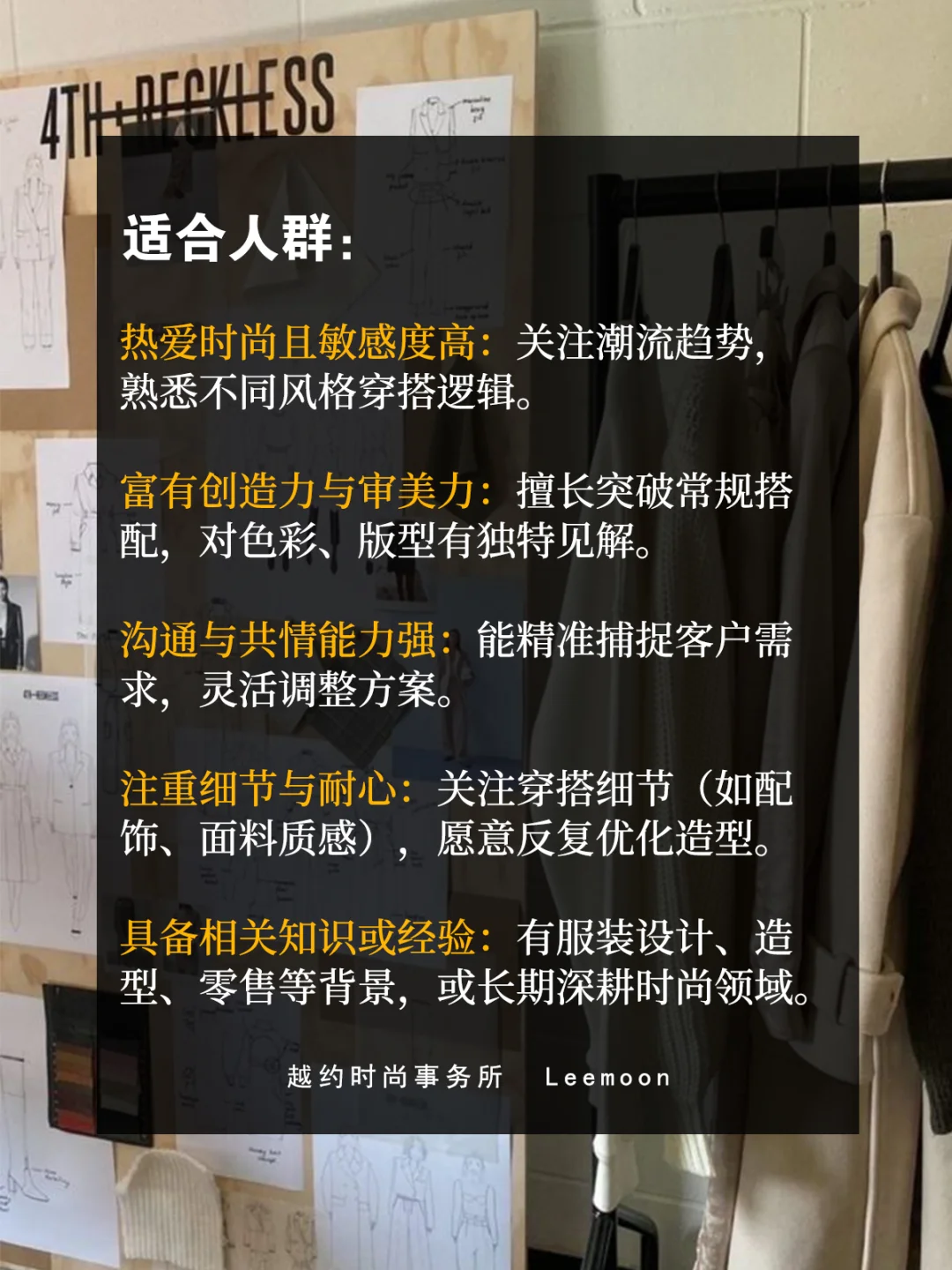 ⑤ 塑造个人风格:挖掘自身审美偏好,形成独特的搭配语言,如擅长混搭小众单品或精于简约高级感造型,用差异化优势在行业中建立个人标签。
