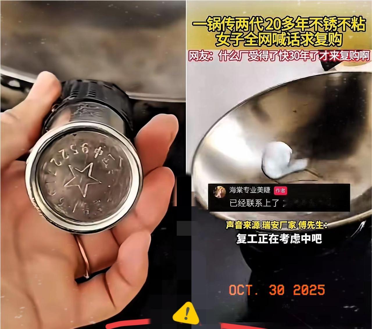 好消息,浙江瑞安铁锅厂准备复工了,大家有地方买锅了。铁锅厂的负责人说,其实他们厂一直都在,只是不生产锅了,改为生产自动化设备了。 想当年,他们的锅从一锤子一锤子的纯手工,到后来的机器升级,质量一直在线,可惜没能扛住市场波动停了产。 说真的,这事儿最让人感动的不是复工本身,而是“老手艺没被彻底丢了”!多少老牌子栽在“丢了初心”上,但这家厂没忘本,还承诺保质量、尽量留老样子,这份实在比啥广告都管用。 现在大家买锅早不缺选择了,但愿意等老牌子的,图的就是那份“用着放心”的踏实感。网友的热情能被看见,厂长还愿意听劝重启生产线,这本身就是老口碑该有的“回响”。 要是开售了,我赌一波很快会被抢,毕竟靠谱的老物件谁不爱?你家里现在还在用老铁锅吗?要是这家厂的锅上架,你会特意去蹲一波不?