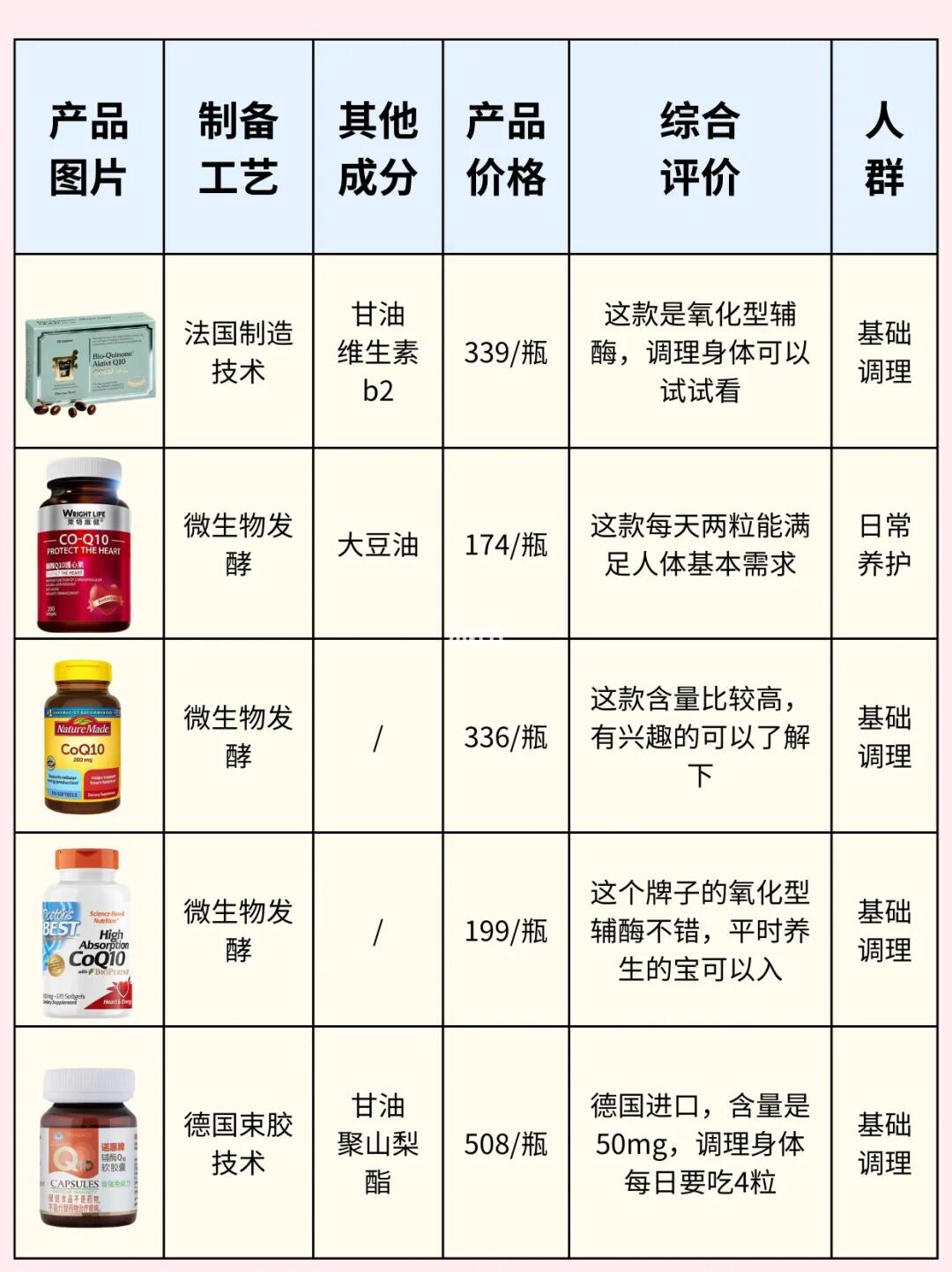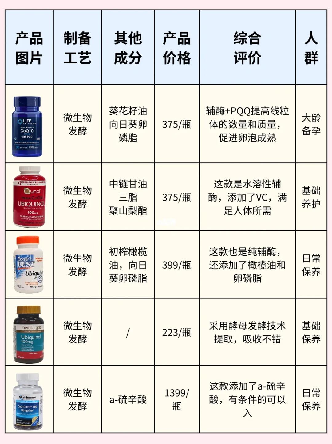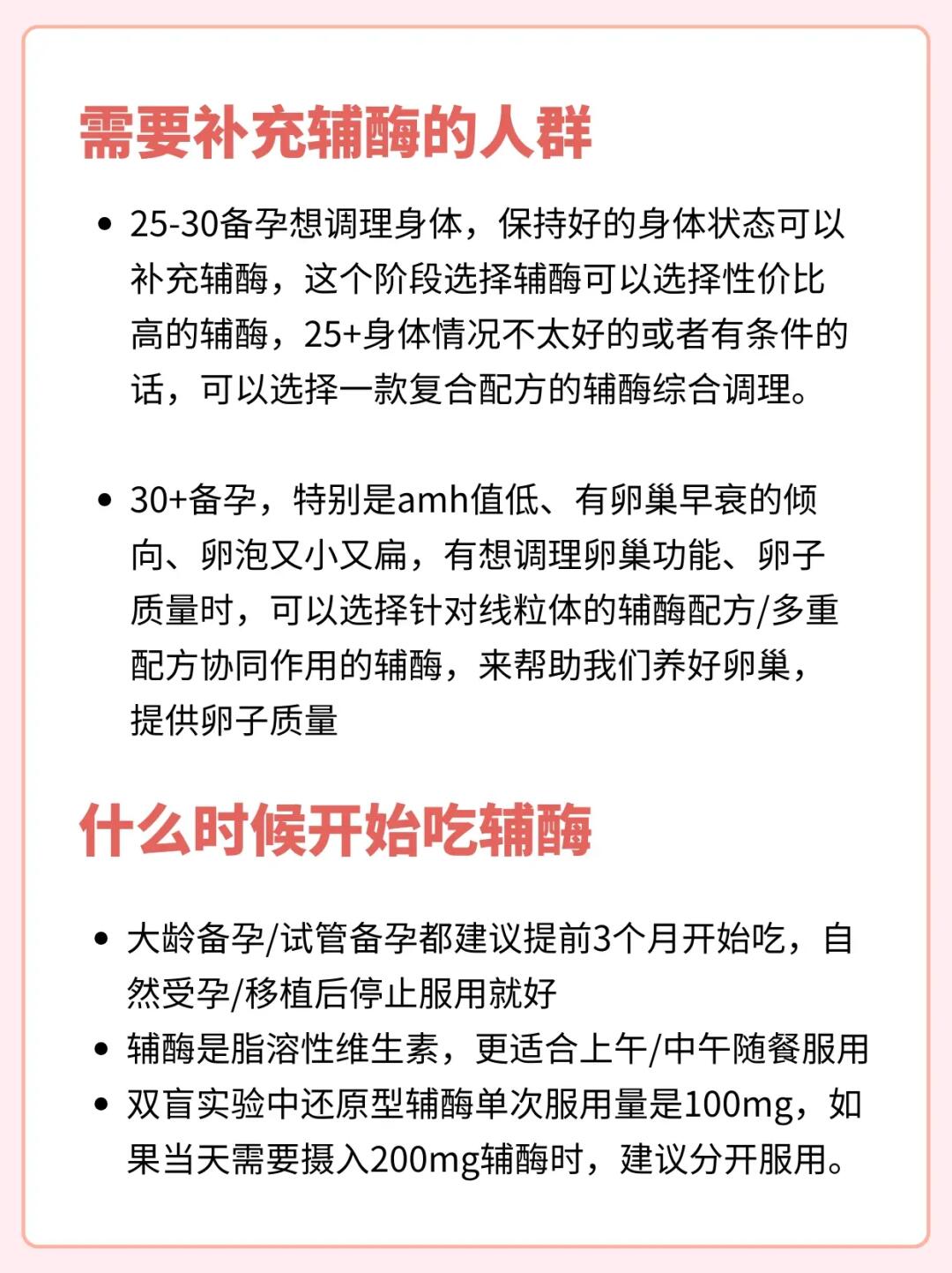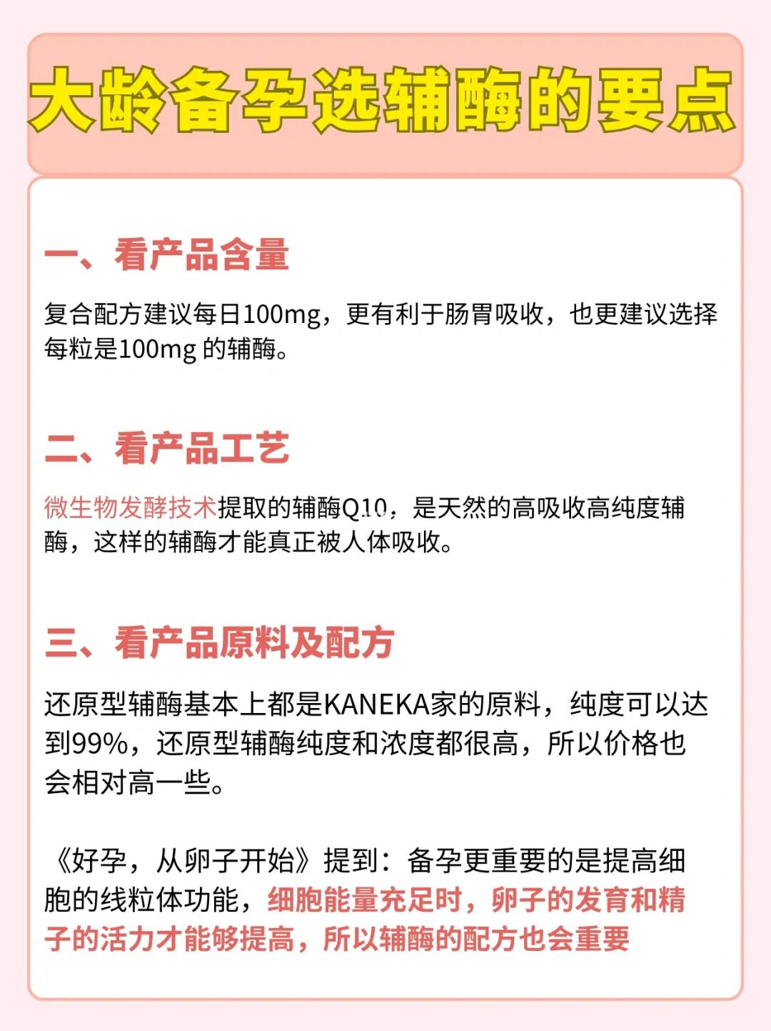 高龄备孕一年多了,两次促排结果都不理想,医生建议我吃辅酶q10调理身体,在自己做了查资料做了很多功课后,才弄明白什么样的辅酶适合大龄和试管备孕。整理10款辅酶q10并做了详细的总结,其中也有我一直在吃的辅酶Q10。 我把挑选辅酶的要点整理成了笔记(图2-3),大龄备孕或准备试管的姐妹们,可以根据自己的情况去选择哦。