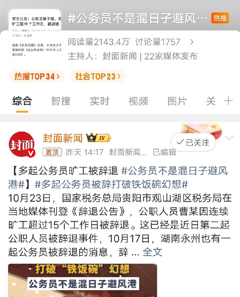 近日,几个单位公告辞退了几名旷工15天的公务员。于是 公务员不是混日子避风港】多起公务员被辞打破铁饭碗幻想这样的词条上了热搜。 拜托!虽然宣传口应该积极向上,让大家不要太执着上岸,但这两起因旷工15个工作日被辞退的案例明显就是当事人跟单位达成一致的结果!实在是成不了让人惊醒的镜子! 再说15个工作日?还有《公务员法》。私企单位别说15个工作日,迟到半小时就打电话问你能不能干,不能干滚蛋! 再说在一部分人眼里如果我考上了公务员不混日子,那怎么证明我饭碗够铁,高人一等! 当然还是希望怀揣梦想的人能进公务员队伍,造福社会,成就自己,而不只是奔着铁饭碗去的。