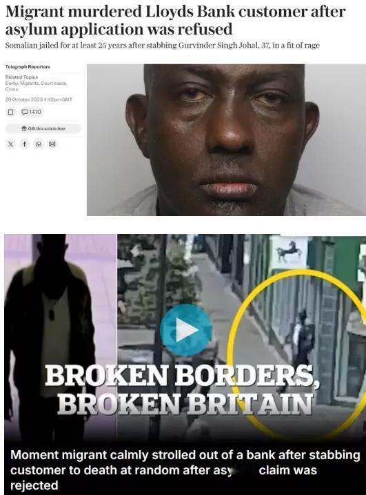 我要找500人陪葬!索马里难民努尔撂下狠话一小时后,真冲进银行一刀捅死了正在给员工取工资的餐厅老板乔哈尔。这个37岁的三个孩子的父亲,倒下时手机里还通着朋友的视频电话。 案发前慈善机构接到努尔的死亡威胁电话后火速报警,警方却没能拦住这场悲剧。努尔一路从意大利混到英国,犯罪记录遍及四国,庇护申请被拒后心态爆炸,借酒撒疯说英国把我当牲口!可再多的绝望,也不是夺走无辜生命的借口! 这事儿表面是随机杀人,实则捅破了英国移民治理的脓包。一边是预警机制形同虚设(警察接警后反应迟缓),另一边是难民安置缺乏心理疏导。努尔案并非孤例!十年前伦敦莱顿斯通地铁站砍人案的凶犯,同样是家人多次报警求助却被忽略。制度性失守,永远由普通人买单! 如今乔哈尔的孩子们哭着问爸爸何时回来,而努尔被判终身监禁。但血案之后,若只谈仇恨不治根源,下一个悲剧还在路口等着。