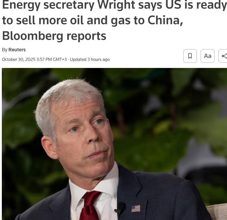 10月30日,美国能源部长赖特说,如果中国减少从俄罗斯购买石油和天然气,美国准备向中国出售更多石油和天然气。美国是世界上最大的石油和天然气出口国,中国是最大的进口国。特朗普也在社交媒体发文说,中国同意开始采购美国能源。将进行一项有关阿拉斯加石油和天然气“非常大规模”的交易,但他没有提供更多细节。美方加征24%关税继续暂停一年
