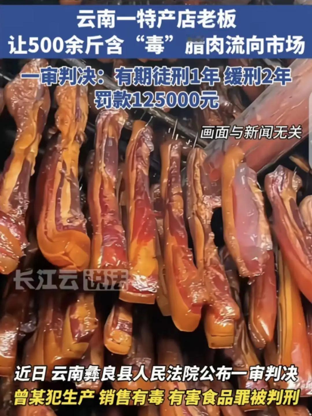 真是丧尽天良!”云南彝良,一名男子将500斤腊肉挂在墙上,先后两次往肉上喷洒敌敌畏,随后将这些腊肉卖出1万多元。 这事说出来都让人齿冷。那男子院里挂着500斤腊肉,油光锃亮看着实在诱人,路过的街坊问起,他拍着胸脯说是老家土猪腌的,纯得很。 可谁能想到,这诱人表象下藏着毒心。他怕腊肉招虫,竟两次拿起敌敌畏往肉上喷,全然忘了这东西是治害虫的剧毒农药,沾了吃食便是催命符 。 老辈人腌腊肉,十斤肉配一斤盐,还要用花椒、陈皮驱虫,哪用得着这般阴招?他偏要走歪路,拿别人的健康换自己的碎银。 张大妈信了他的鬼话,买了三斤回家炖。刚开锅就飘来一股刺鼻怪味,不是腊肉的咸香,倒像是地里打农药的气息,吓得她赶紧关了火。 找男子理论,他倒嘴硬,说是大妈炖肉的方法不对。大妈气不过,跟同样买了肉的邻居李大哥一合计,直接报了警。 警察一查,当场搜出半瓶敌敌畏,没卖完的腊肉凑近闻都有淡淡的药味。检测结果更是惊人,腊肉里敌敌畏含量最低0.06mg/kg,最高达1.1mg/kg,而国家规定食品中根本不允许检出这东西。 要知道,敌敌畏这玩意儿能通过呼吸道、胃肠道吸收,长期摄入会伤肝肾,严重时还可能引发中毒性疾病 。这哪是卖腊肉,分明是递毒药。 大伙本以为这黑心人得重判,毕竟往食品里加毒,跟谋财害命没两样。可判决下来,却让人跌破眼镜:罚款12.5万,有期徒刑一年,缓刑两年。 意思很明白,只要两年内不犯事,这牢就不用坐。网友们瞬间炸了锅,质疑声一片:“赚一万罚十二万看着多,缓刑等于没震慑!” 再看那些同类案例,有人用甲醛泡银鱼卖,直接判了十一年 。这往腊肉里喷农药的,反倒能缓刑,岂不是让人觉得违法成本太低? 民以食为天,食品安全是底线中的底线。这般故意在吃食里下毒的行为,若是轻饶了,只会让更多人铤而走险。 罚款能弥补健康损失吗?缓刑能震慑黑心商贩吗?恐怕都不能。老百姓要的,不过是一口放心饭,可这点诉求,为何要靠睁大眼睛提防来实现?