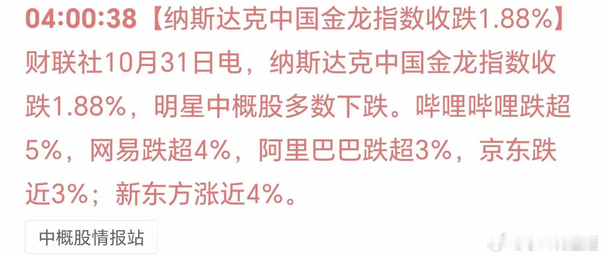 纳指中国金龙指数下跌1.88%!
