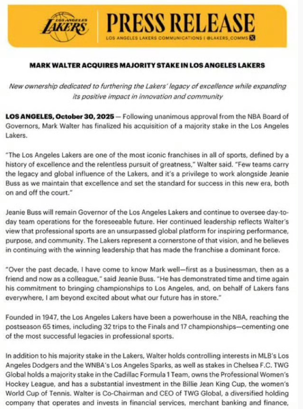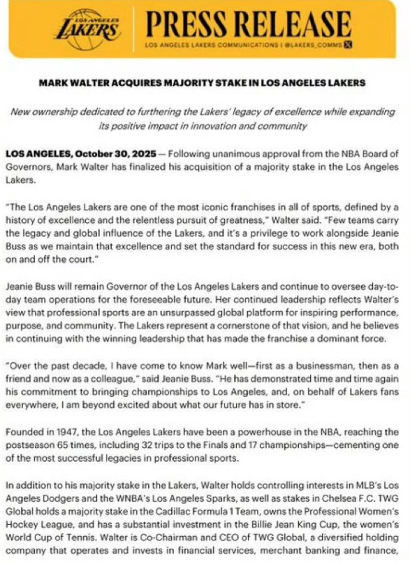 NBA董事会正式批准马克·沃尔特收购湖人多数股权的交易!珍妮阿姨将在交易完成后至少五年内继续担任球队总裁。