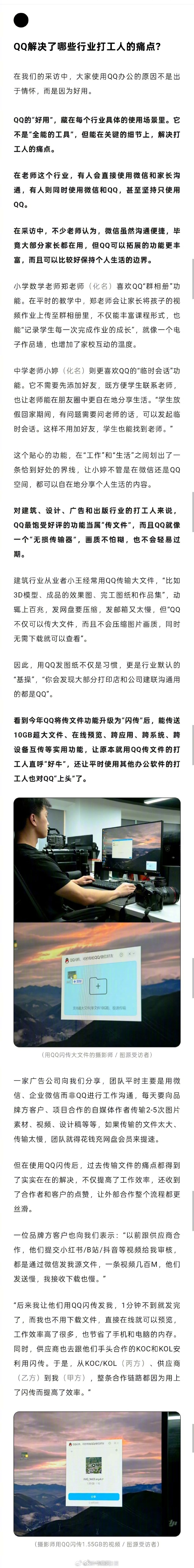 使用QQ办公的用户分布非常广:从国企、学校、出版社,到建筑、设计、广告公司;年龄跨度从20多岁的新人到40多岁的老职工都有。QQ就像他们的“职场发小”,那个蓝色气泡图标就是“开始一天”的信号。