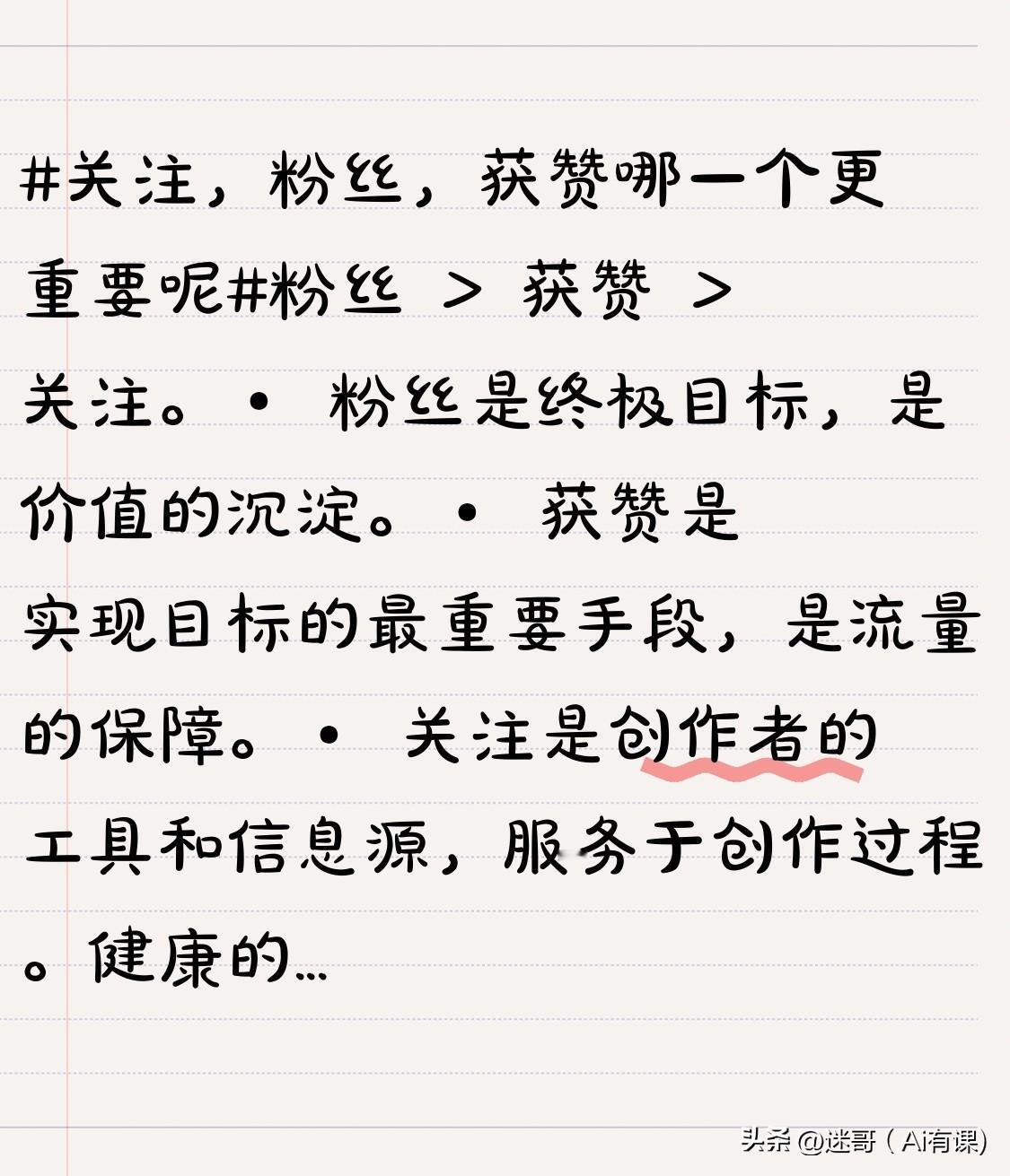 粉丝 > 获赞 > 关注。 · 粉丝是终极目标,是价值的沉淀。 · 获赞是实现目标的最重要手段,是流量的保障。 · 关注是创作者的工具和信息源,服务于创作过程。 健康的增长模式是:用“高赞”的爆款内容作为引擎,将路人转化为“粉丝”这份资产,并通过“关注”来优化你的信息输入,从而持续产出更好的内容,形成正向循环。