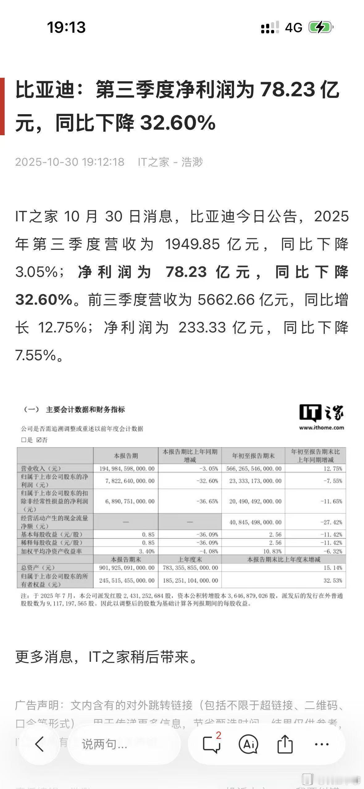 比亚迪的第三季度营收出来了,同比下降3.05%,净利润同比下降32.6%,前三季度净利润同比下降7.55%。