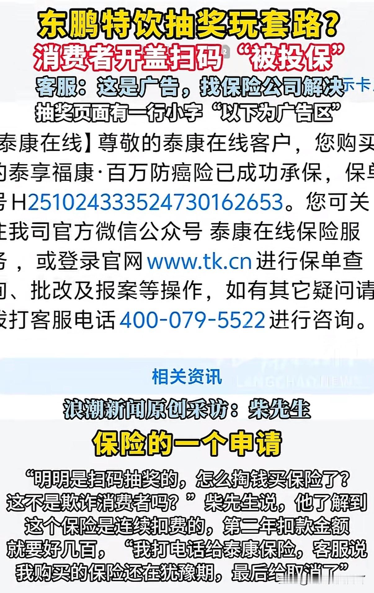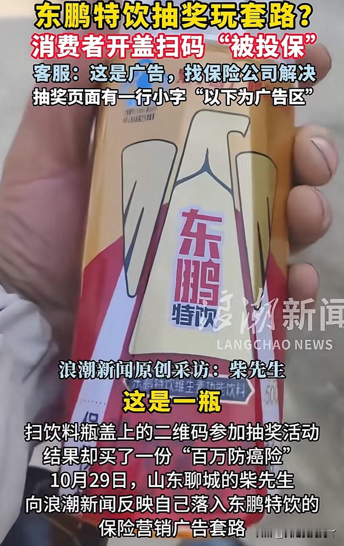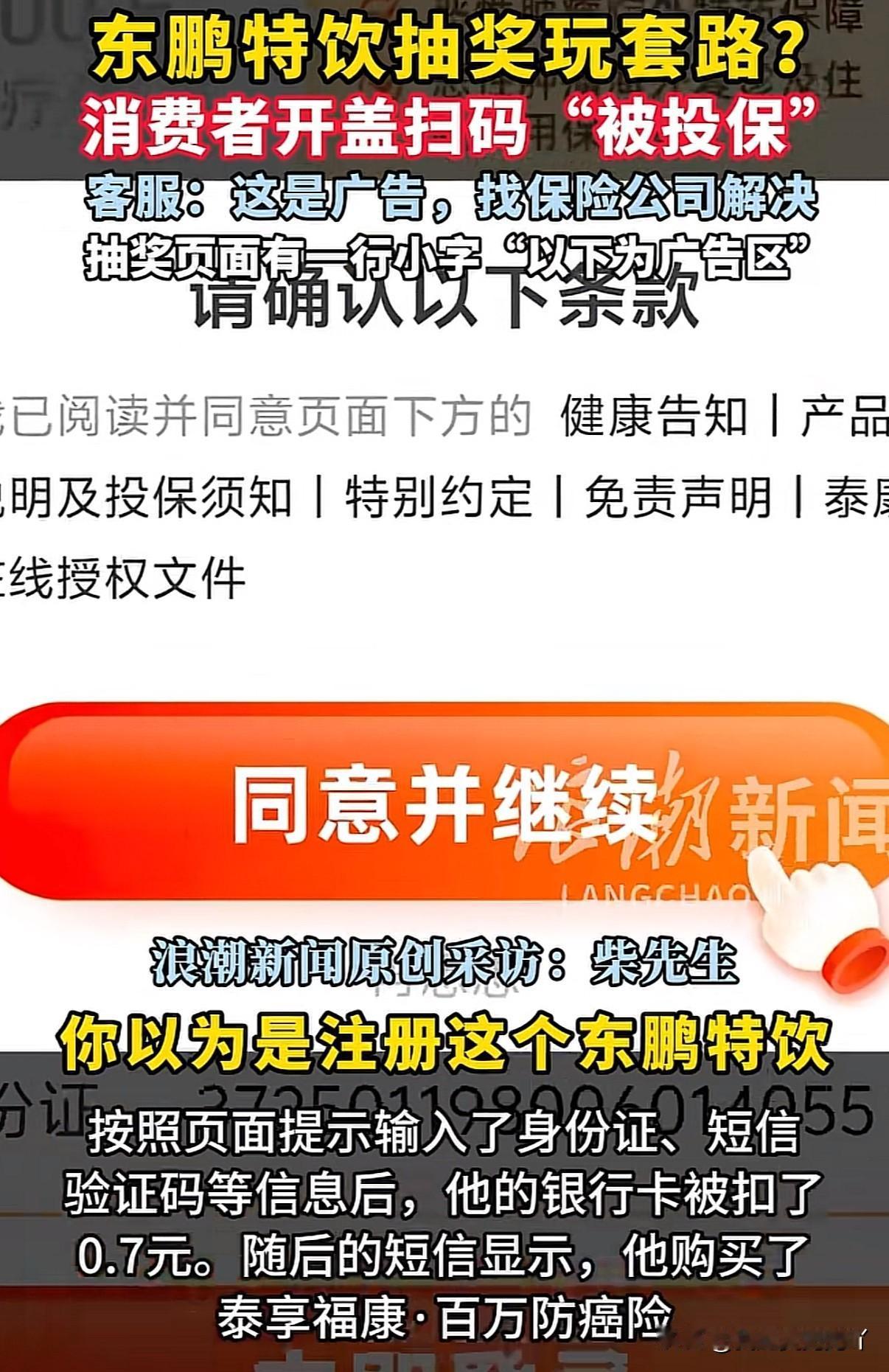 买饮料扫码抽奖却被套路花钱买保险 二维码别乱扫商家套路深一不注意就上当 10月29号山东聊城的柴先生买了一瓶饮料,扫了瓶盖上的二维码抽奖却收到银行扣款信息,显示柴先生购买了泰康百万防癌险 本来是扫码抽奖怎么就买保险了呢,柴先生找到饮料厂家,厂家工作人员表示:这就是广告页面有小字提醒是柴先生没看清,投保了就找保险公司与他们无关 后柴先生又找到保险公司提出退保,好在刚投保还在犹豫期得以顺利退保,不然又要莫名其妙一年被扣好几百的保险费 提醒大家抽奖二维码别随意扫,填写个人资料时更要谨慎 信源:浪潮新闻