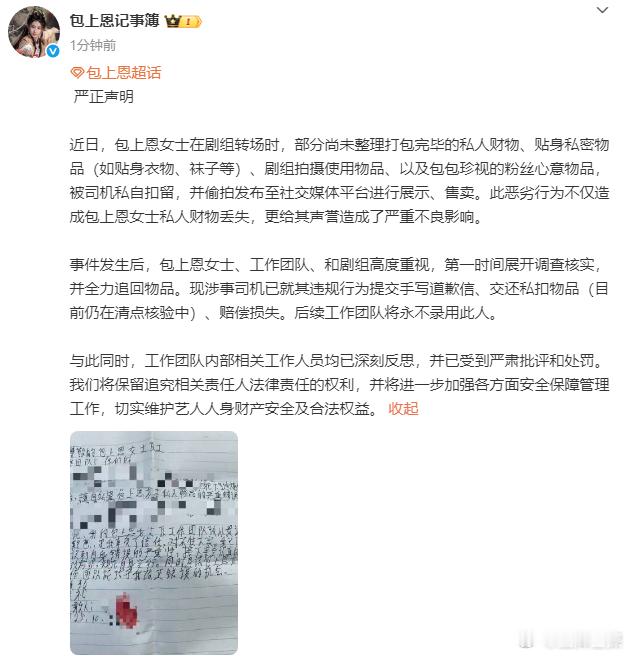 包上恩声明 包上恩工作室严正声明:涉事司机已向包上恩手写道歉信、交还私扣物品(目前仍在清点核验中)、赔偿损失,后续将永不录用此人。请切实维护艺人合法权益,也请大家多关注妹妹的在播剧 水龙吟 [作揖]