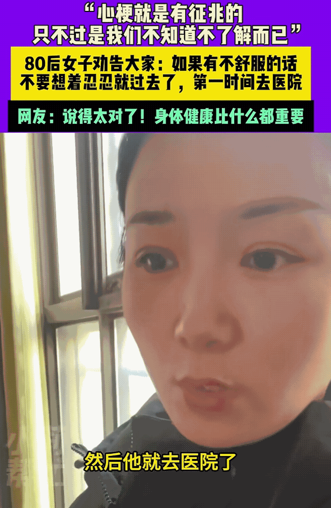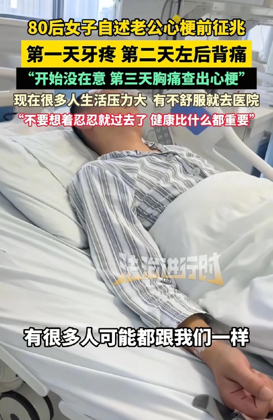 “说的太好了,身体健康比什么都重要 !”一女子分享自己老公心梗前两天的 身体状况。提醒大家,如果不舒服,不要忍忍就过去,一定要去医院检查 。 女子的老公得了心梗,在确诊心梗前两天 ,其实就已经出现征兆 。只是他们当时不知道而已 。女子将经历分享出来,希望大家在身体不舒服的时候要及时去医院检查 ,以免耽误病情 。 此事引起网友热议 ,我爸脑梗就是腰痛了一个星期,还以为是做事扭到了没怎么在意,凌晨就突然半边手脚不能动,还不会说话不认识人。所以身体有不舒服的地方一定要引起重视。 就像这个女子说的一样 ,我们平日里总认为小疼小病的没有什么障碍 ,忍忍就好了 。其实这是给大病埋下了种子 。多多检查,有个好身体比什么都强 。 对此你有什么看法 ?