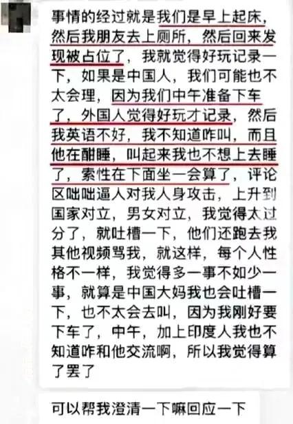 “因为是外国人睡在自己床上,觉得好玩才记录。” 女子卧铺被外籍男子占用事件后续来了,对于网友的吐槽,女子觉得自己很委屈: 1.因为是外国人睡在床上,觉得好玩才记录。 2.英语不好,不知道怎么叫,也快下车了。 3.被别人睡过都床,自己也不想在上去睡了,索性在下面坐会。 可以看出,这个女孩长的很漂亮,穿衣也很有品,她做的这件事确实不妥当。 虽然女子不叫醒外籍男子的理由有很多,但这件事看下来还是觉得非常别扭: 1.为什么因为不会英语而不去叫醒呢?在我们国家,用自己的语言去叫醒他,也是合情合理,重要的是他太没礼貌,随意睡别人的床。 2.即使快要下车,也应该让车上乘务员来处理,让那位外国男子懂得,要遵守我们的规则和法律,你一声不响,让大家觉得你不维护自己的权利,助长别人的歪风邪气。 3.按说,只要能上了火车,就有自己的铺位,那位外籍男子为什么不去自己的铺位上去呢? 他如果是在逃票,必须找列车员处理,再不行可以叫乘警,让他得到惩治才能让大家服气。 不过,也有人表示,国内这位乘客很善良,自己不想睡,就让太困太累的人休息一下。这种利他主义思想应该提倡。大家怎么看?坐卧铺见闻