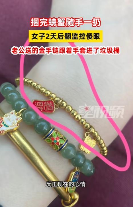 “这下后悔了吧!”10月27日,安徽蚌埠,一女子戴着金手链绑螃蟹,结果干完活不慎将金手链和一次性手套一起丢进了垃圾桶,粗心的女子几天后才发现金手链丢失,可垃圾早就被老公扔到垃圾站!网友:这得再绑多少螃蟹才能换回一个金手链! 最近,王女士(化名)丢失金手链的经历,引发了很多人的关注,也让人看到生活里的小动作,有时会造成很大的损失。 那天王女士在家处理螃蟹,厨房台面上摆着盆、水、绳子,整个操作区比较乱,她一边说话一边干活,注意力分散,完全没有意识到手上还戴着金手链。 她没有停下来检查,也没有提前把饰品摘下来放好,就直接开始处理螃蟹,忙起来以后对手上的东西也毫无感觉。 工作结束后,她摘下手套,做了一个很顺手的动作,把手套往垃圾桶里一扔,因为手链在干活过程中被卡住,顺势也跟着手套一起掉了下去。 她没有停下来,金手链就这么被随手处理掉了,整个过程不到几秒,全凭习惯。 丢失当天,她对手上少了的东西没有任何察觉,继续正常生活,等到几天后整理衣着时,她才突然发现手链不在手腕上,因为佩戴多年,她已经习惯它的存在,所以反应过来时整个人都愣住了。 之后她赶紧寻找,刚开始怀疑手链是不是被水冲进了下水道,于是她仔细检查滤网;又怀疑是不是被螃蟹勾掉了,翻遍包装、柜子、抽屉,还打开首饰盒确认是不是放错地方。 直到回放录像后,她亲眼看到自己摘手套并顺手丢弃的一瞬间,手链正好跟着掉进去,看到视频直接愣住,整个真相一下子清晰了。 但是当天,丈夫打扫卫生,把垃圾袋扎好丢进垃圾站,垃圾分拣完成后,想找回几乎没有可能,等她知道真相后,垃圾早已处理完。 这次损失让王女士完全接受不了,这条手链是丈夫送的生日礼物,佩戴时间很长,早已产生情感依赖,丢失后,她懊恼和自责了好几天。 加上最近金价上涨明显,这条克数不少的手链已经价值不低,等于直接损失了一大笔钱,有人调侃说“这得绑多少螃蟹才换得回来”,虽说是玩笑,但也反映了现实压力。 这件私事被传到网上之后,引发了大量讨论,评论里有人批评她太疏忽,也有人温和地建议平时注意贵重物品保管,很多网友在留言里分享类似经历,把这件事当成一堂生活经验课。 王女士吃一堑长一智,表示今后不会再戴着金饰做脏活累活,会提前摘下收好。 信息来源:《绑完螃蟹随手一扔,女子2天后翻监控傻眼:老公送的金手链跟着手套进了垃圾桶》星视频