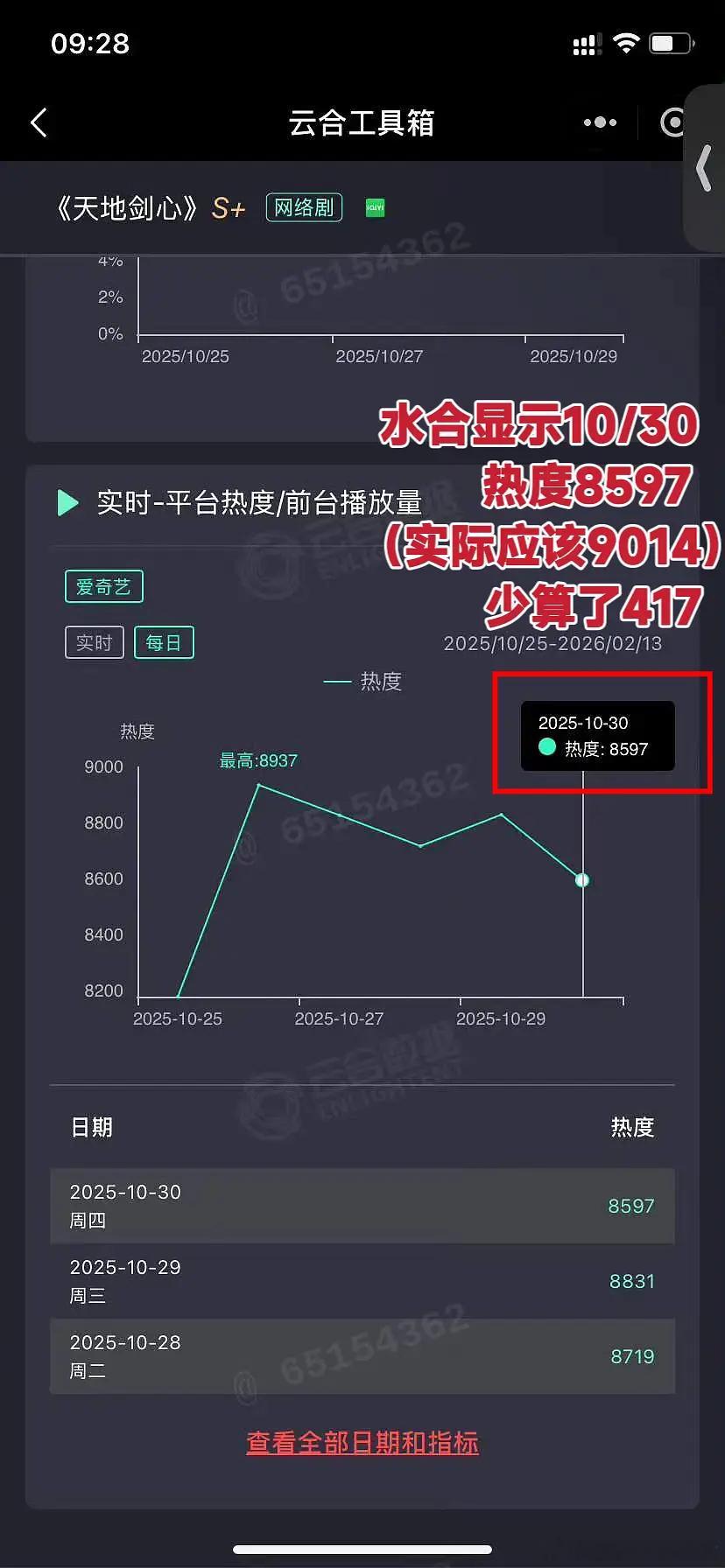 云合你就直说针对ee吧,没有平台接口实锤,爱奇艺热度峰值9014,今天云和前台播放量手动降热度417点,8597的数值哪来的都不知道,怎么还可以编造一个随意的低热度来拟合播放量啊。被骂了才灰溜溜地改回来,这不是更锤了明目张胆地造假吗,全程视j粉圈的第三方小公司,到底谁还在捧云合啊[笑cry]