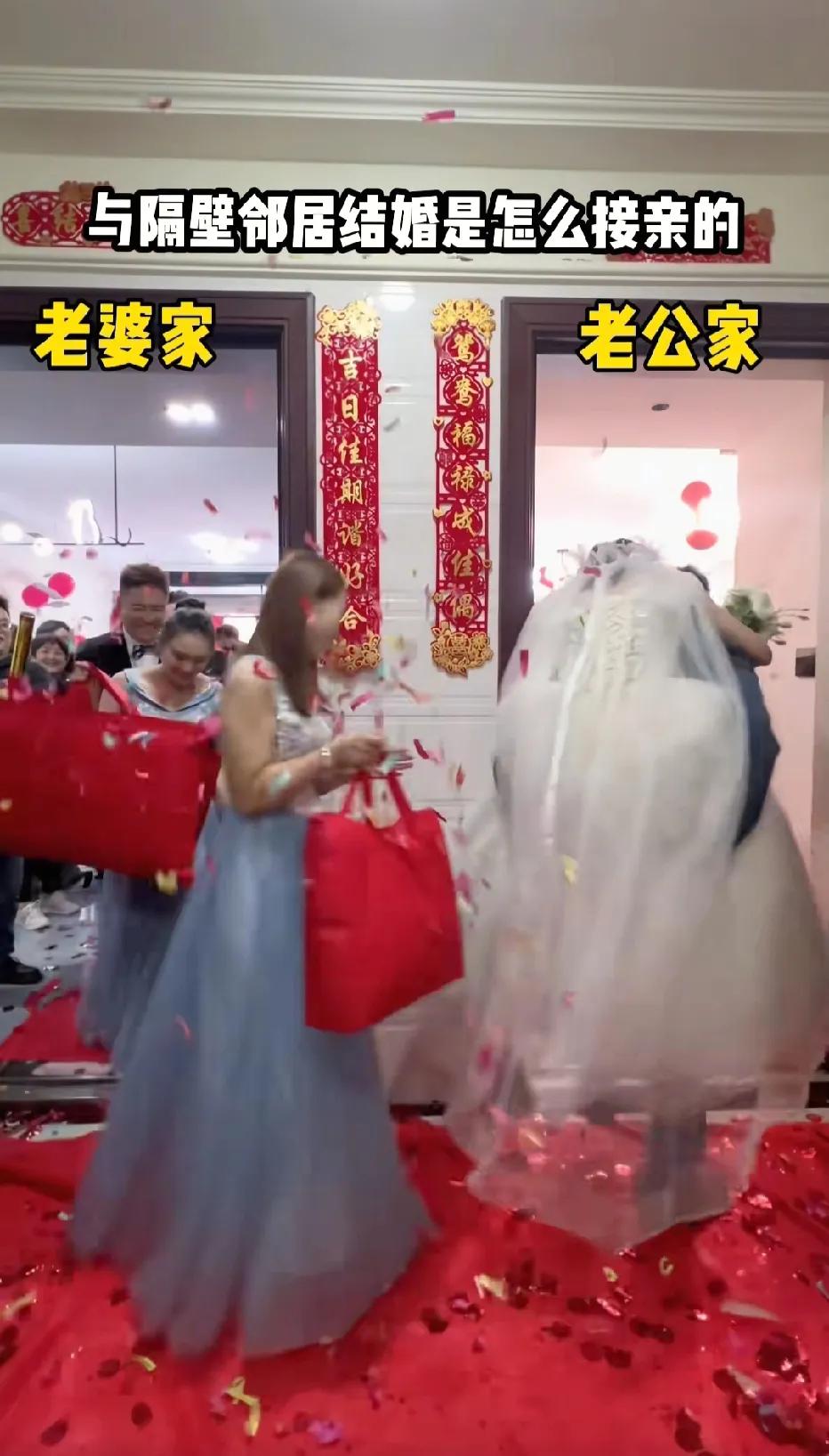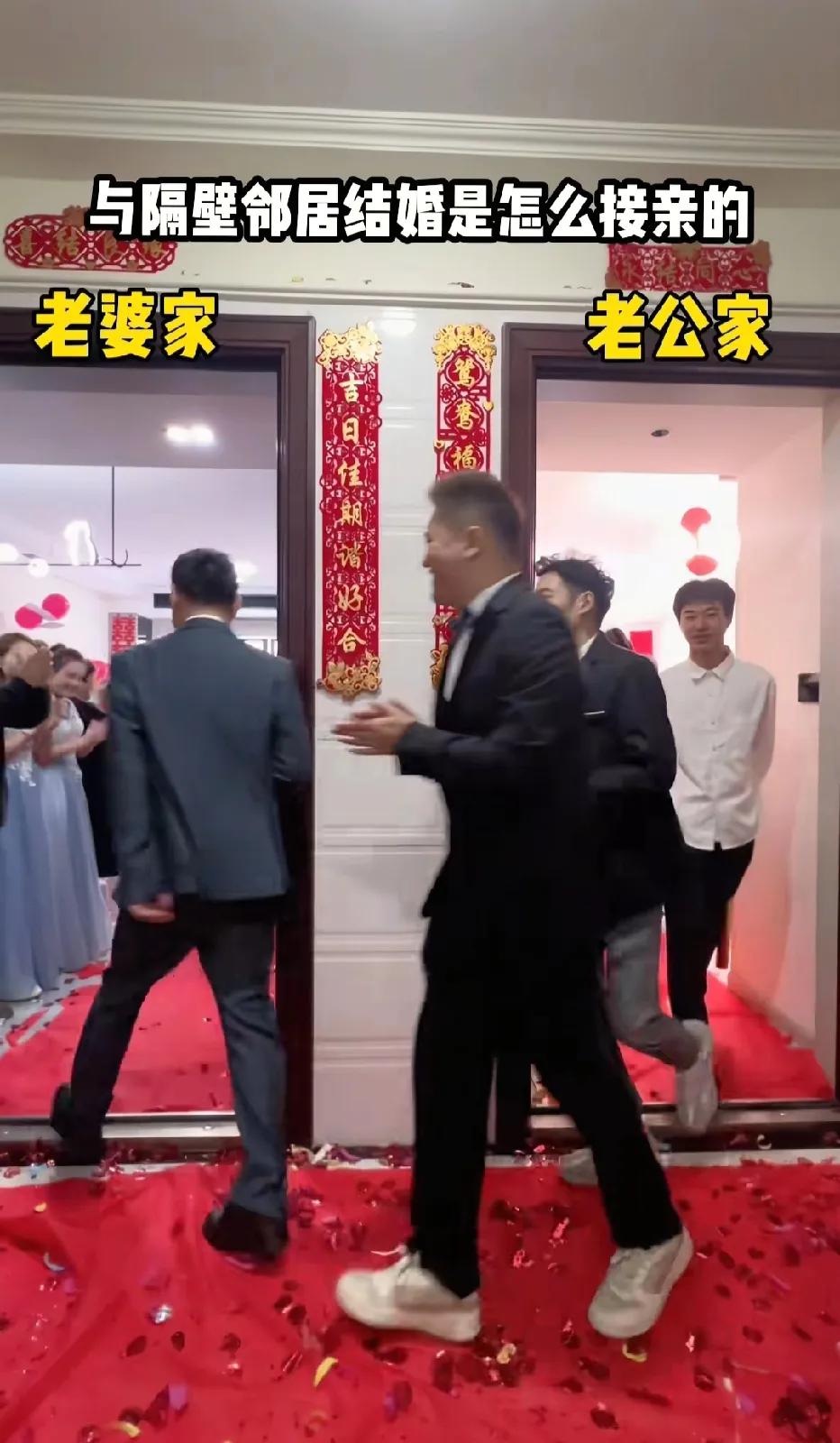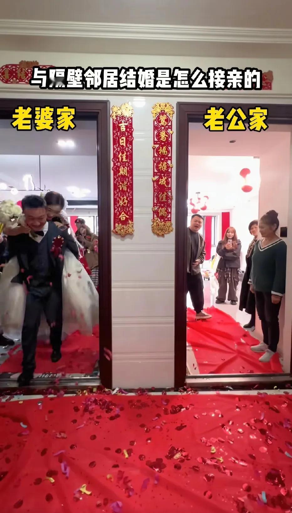 当你娶一个隔壁邻居当老婆是什么体验?看看这个兄弟,只能说一个字:服!出家门走两步就到新娘家接亲了,这也太省事了!不需要婚车,接亲的时间上也充裕[呲牙],家人就在隔壁等着。 我看到有人说,不是说兔子不吃窝边草吗?还有人说,这婚结的,得省下多少钱?甚至还有人担忧说,住这么近以后两家有的闹喽。 哈哈,小打小闹没事,谁家生活里没有一些小摩擦?鸡毛蒜皮的事,互相理解就好。盼点好的哈! 挺羡慕这样子的氛围,以后,回家吃饭,想在哪个屋吃,就去哪个屋吃,家人们都在身边,这要是逢年过节,节日上,不知道两家得有多热闹![赞][赞]大家说呢?邻居家的儿媳