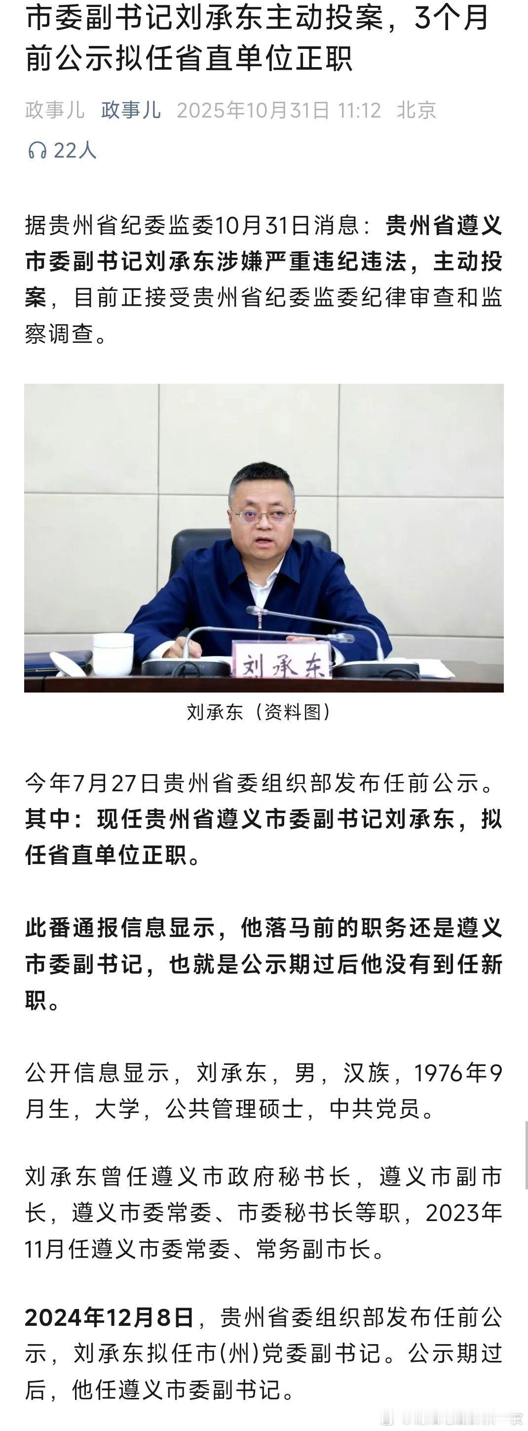遵义市委副书记刘承东主动投案,3个月前公示拟任省直单位正职。热点现场