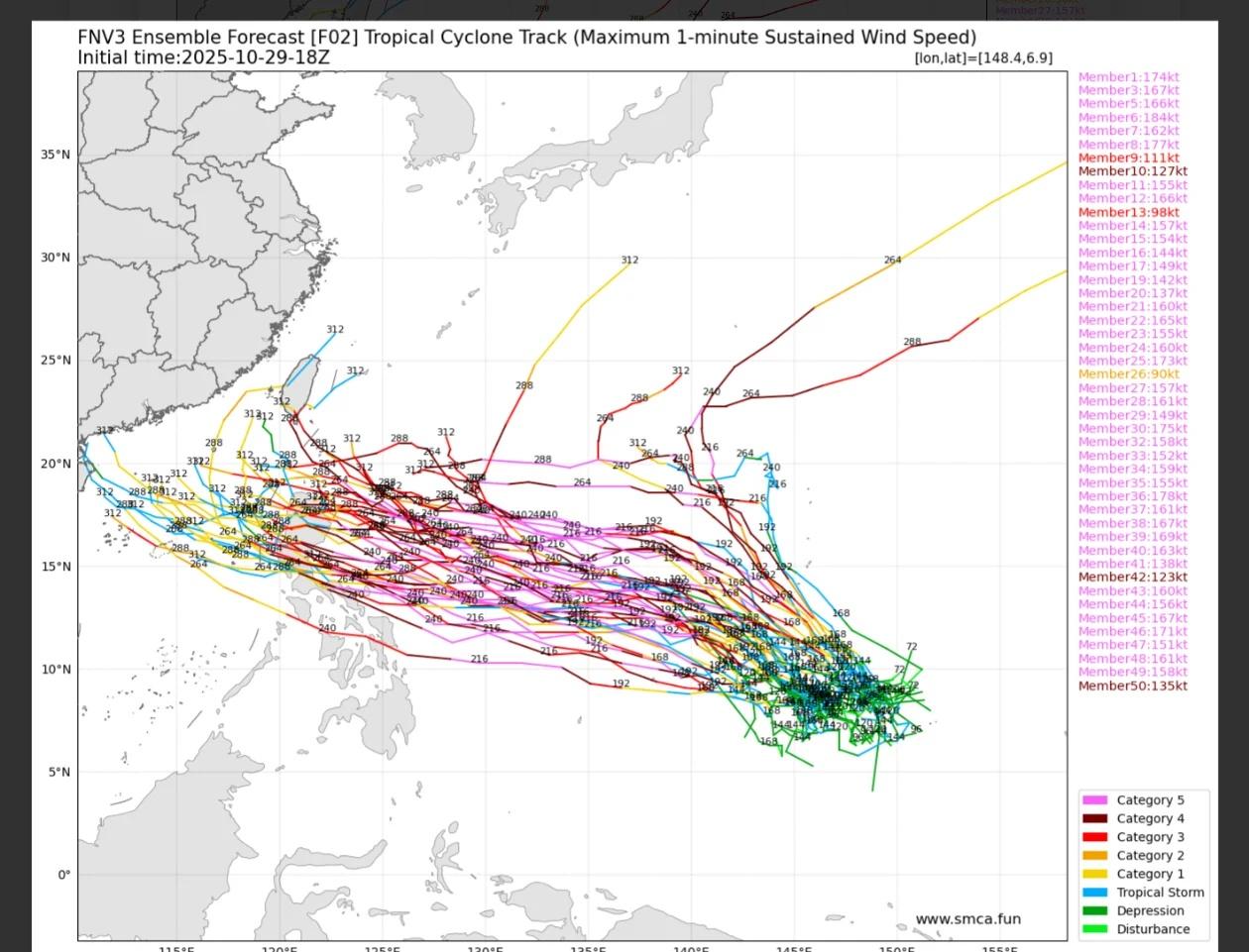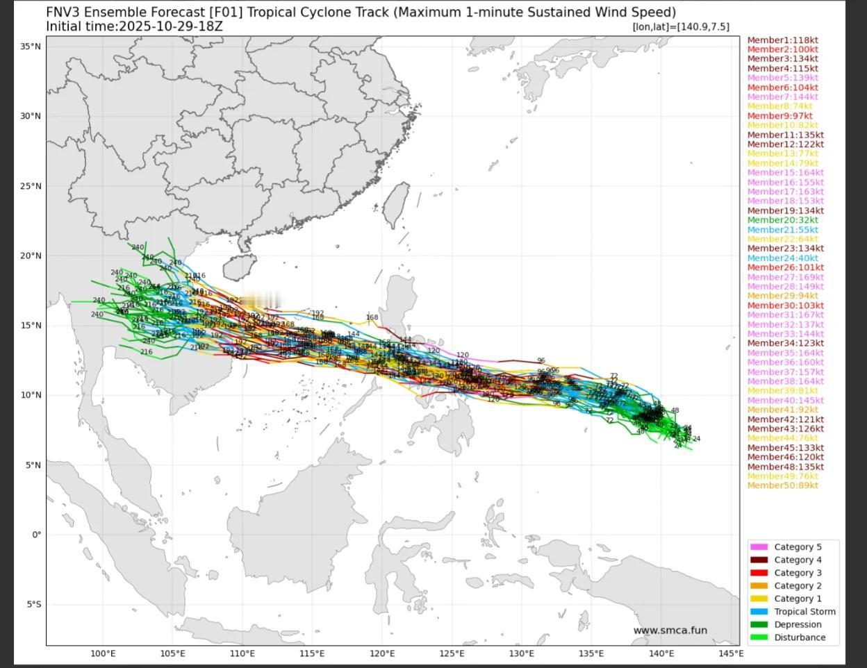 双台风系统预报 未来的10天内会先后生成2个台风,其中热带系统1已经生成对应的台风胚胎98w,两个台风系统的强度均大幅度调强,98W生成台风的最高强度由12~14级调强至14~16级,预计登陆路径不变,登陆越南中部 第二个台风系统强度也大幅度调强,预计未来的最高强度稳定维持在17级以上,150KT/160KT~180KT。甚至有成员给出了184KT的极端强度值。路径可能性是坐巴士海峡直接进入南海,在冷空气的影响下快速减弱。也有可能近海转向