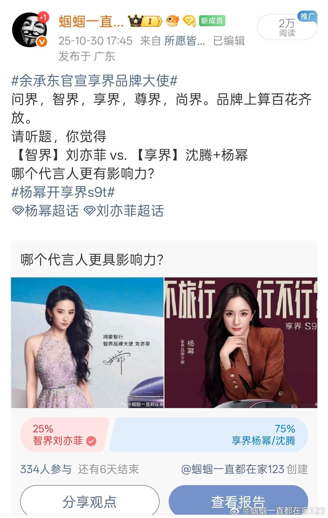ps:昨天发起了个投票。智界刘亦菲 vs. 享界杨幂,330多人投票一三开的比例...确实...大幂幂的影响力更足些呢。神仙姐姐最近还是太低调了[doge]