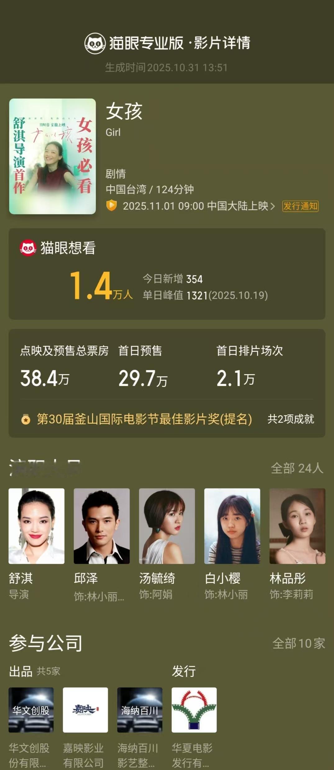 钟楚曦[超话]钟楚曦包场支持舒淇导演首作女孩 据猫眼专业版云包场显示,包场支持导演首部自编自导作品《女孩》,影片将于11月1日全国上映,一起见证她镜头下的真挚与细腻!钟楚曦包场支持女孩