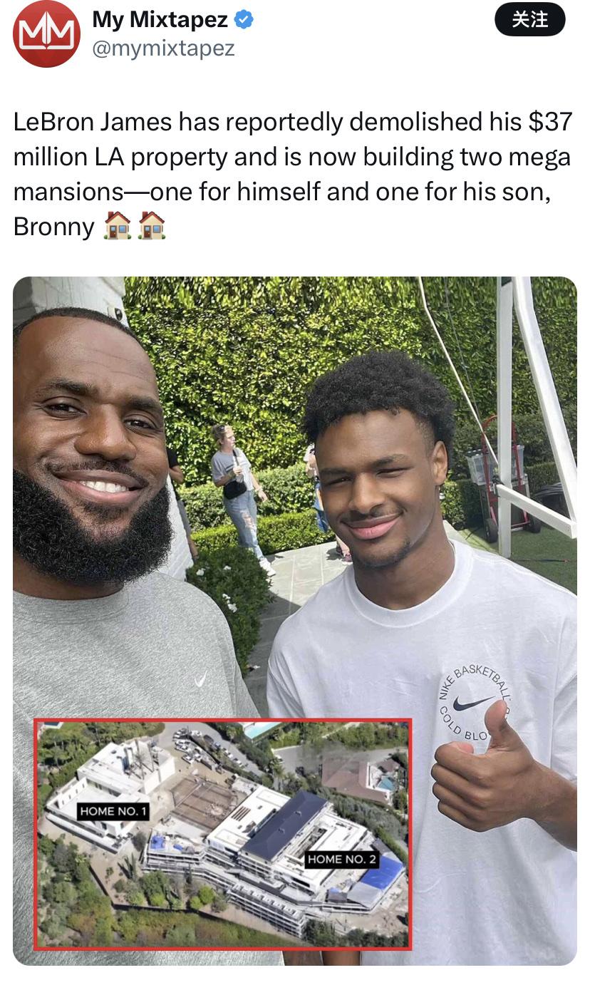 老詹开始给布朗尼盖新房了! 据美媒报道,詹姆斯已经拆除了洛杉矶价值3700万美元的房子,开始建造新的豪宅。 一座给布朗尼,一座自己住。 布朗尼大了,要有自己的生活了,老爹詹姆斯为布朗尼又是找工作,又是盖新房的,也是操了不少心。 就是布朗尼在球场上太弱了!没有老爹霸气!