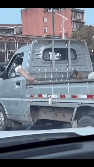 一男子开车等红灯,还不忘在后边的毛孩子。