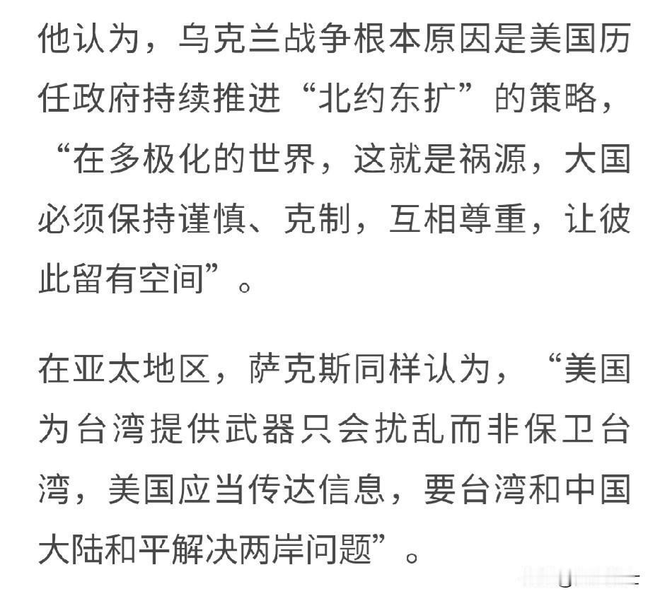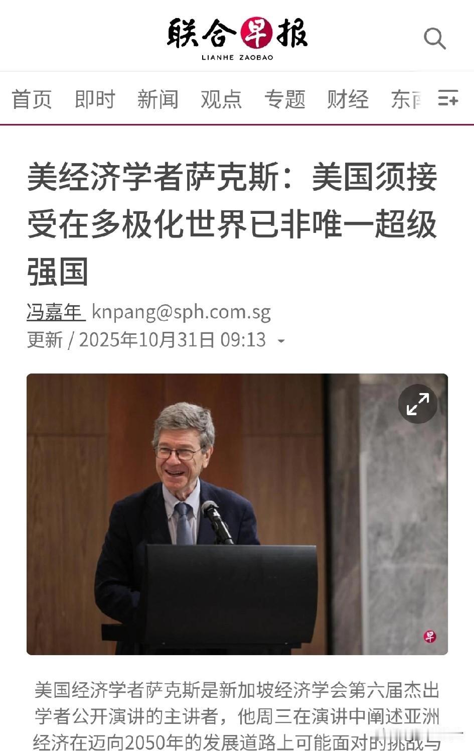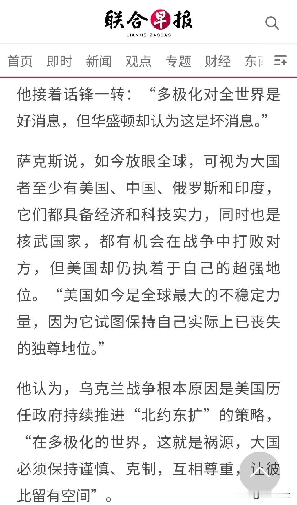 美国必须接受其在多极化世界中已非唯一超级强国,美国哥伦比亚大学教授兼可持续发展中心主任萨克斯日前在新加坡某论坛讲座上如是说到。 他说多极化世界是时代趋势,对经济全球化是有利因素,但美国认为这是坏消息,不愿意承认和接受它。他还说美国是全世界最大的不稳定因素,因为他试图维持他自己已经丧失的唯一超级大国的地位,这也造成了俄乌战争的爆发,因为这是美国政府这些年一直力推的“北约东扩”策略所导致的。他还说美国对台军售破坏了台海平衡,而这并非是对台有多友好,还危害亚太安全。 在我看来,美国这种有这种远见的正义人士绝不在少数,他们看透了美国政策的虚实,如今连川普都承认中美是“G2”,希望美国不要一错再错,霸权主义终究是要结束的。