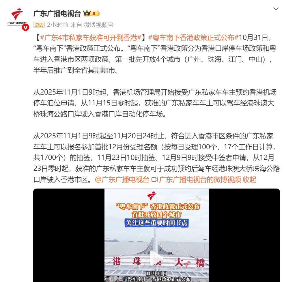 广东4市私家车获准可开到香港 “粤车南下”省流版:11月1日9时起可报名,首批一共放1700个名额,获准车辆从12月23日零时起,可以驾车经港珠澳大桥珠海公路口岸驶入香港市区。目前只开放4个城市,广州、珠海、中山和江门,没有离香港最近的深圳,半年后推广到全省其他地市。看了一眼流程,还挺麻烦的,但多少是往前迈了一步,中签的小伙伴记得晒一晒哈。