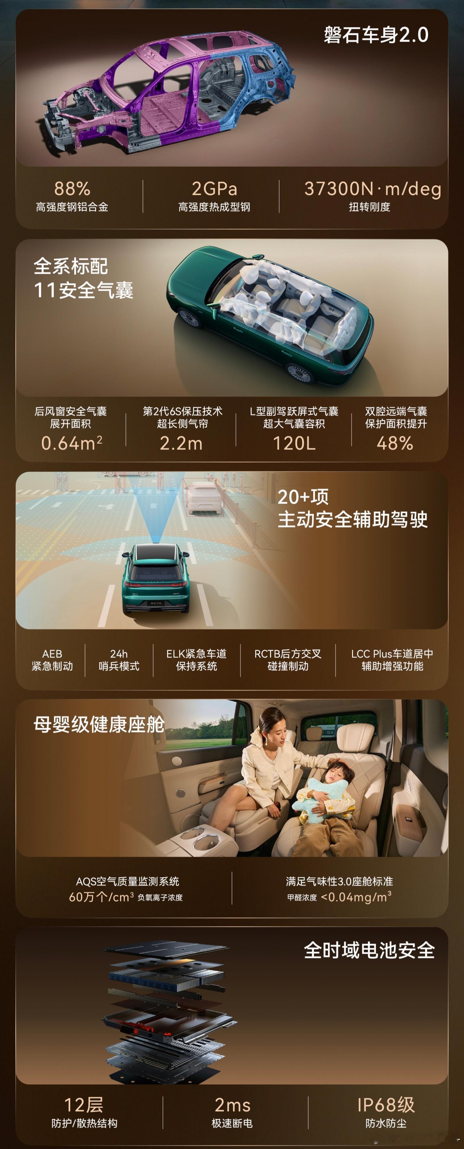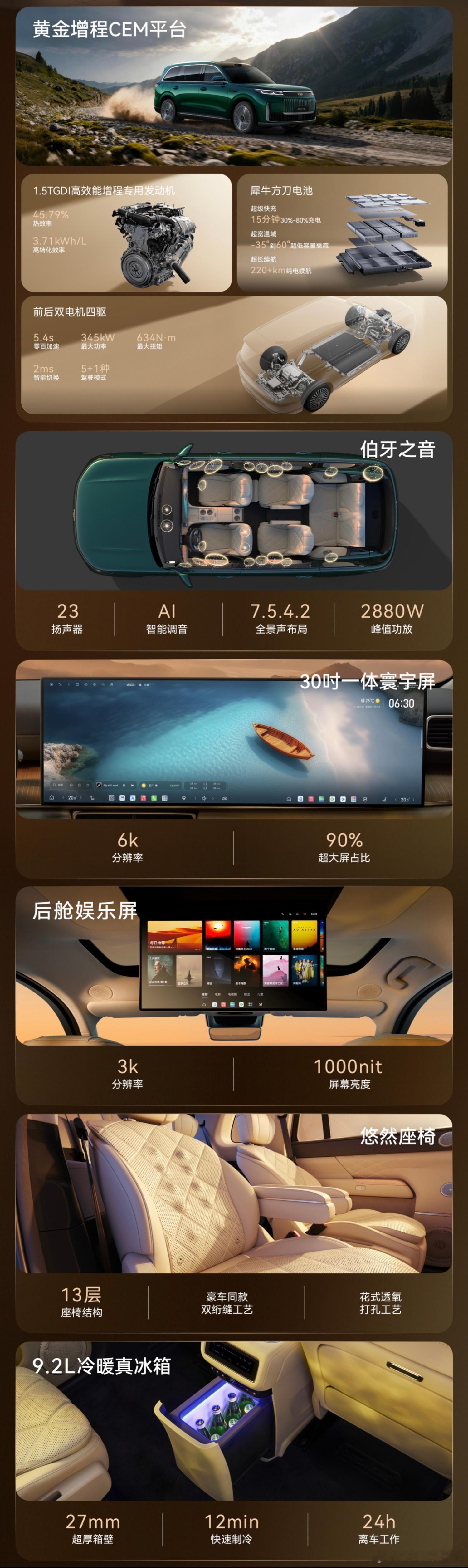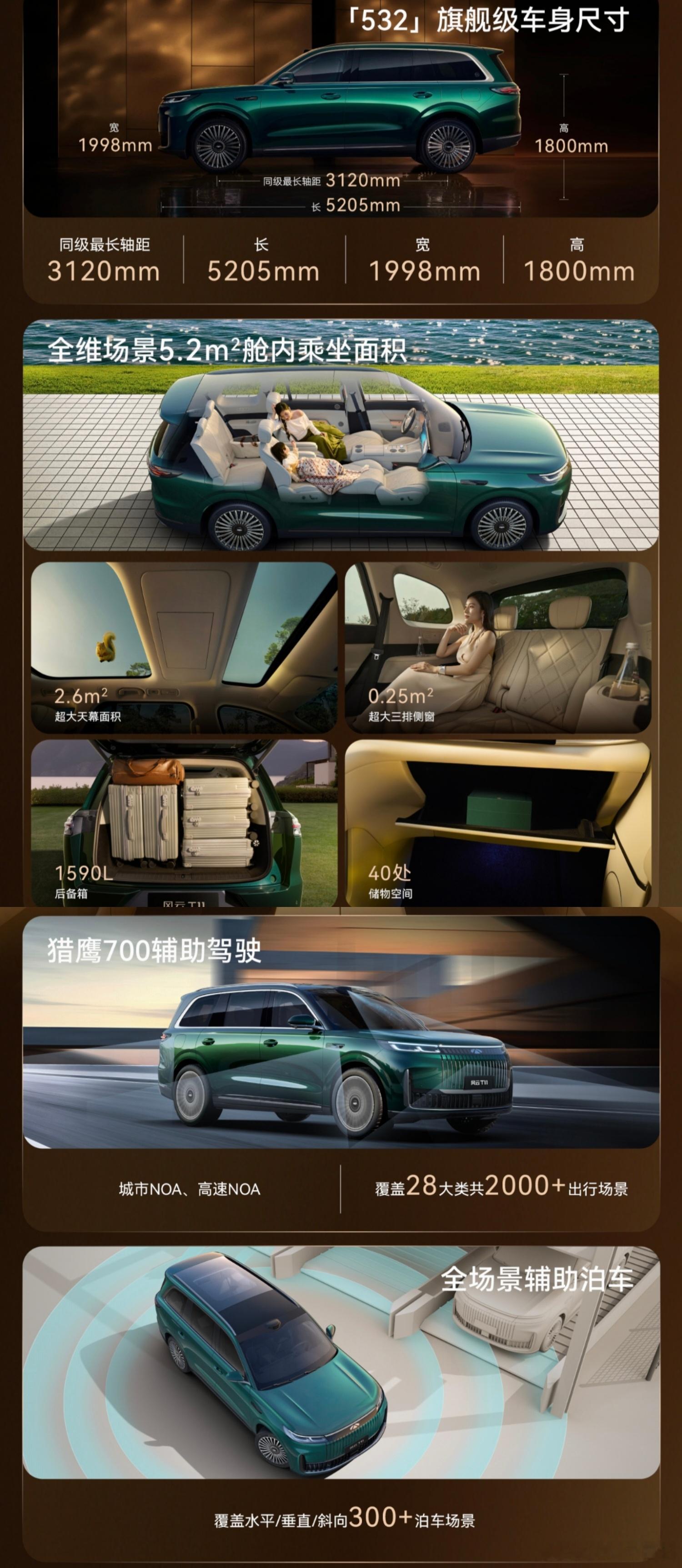 包括但不限于猎鹰500(高快NOA/智能泊车)、气囊更多(主驾膝部/前排中部/三排后部)、更多的驾驶模式、NFC钥匙、夹胶隐私玻璃、外后视镜记忆/下翻、内后视镜自动防眩目、一二排记忆、二排加热通风、30吋6K车机大屏、5G网络、主动降噪等等