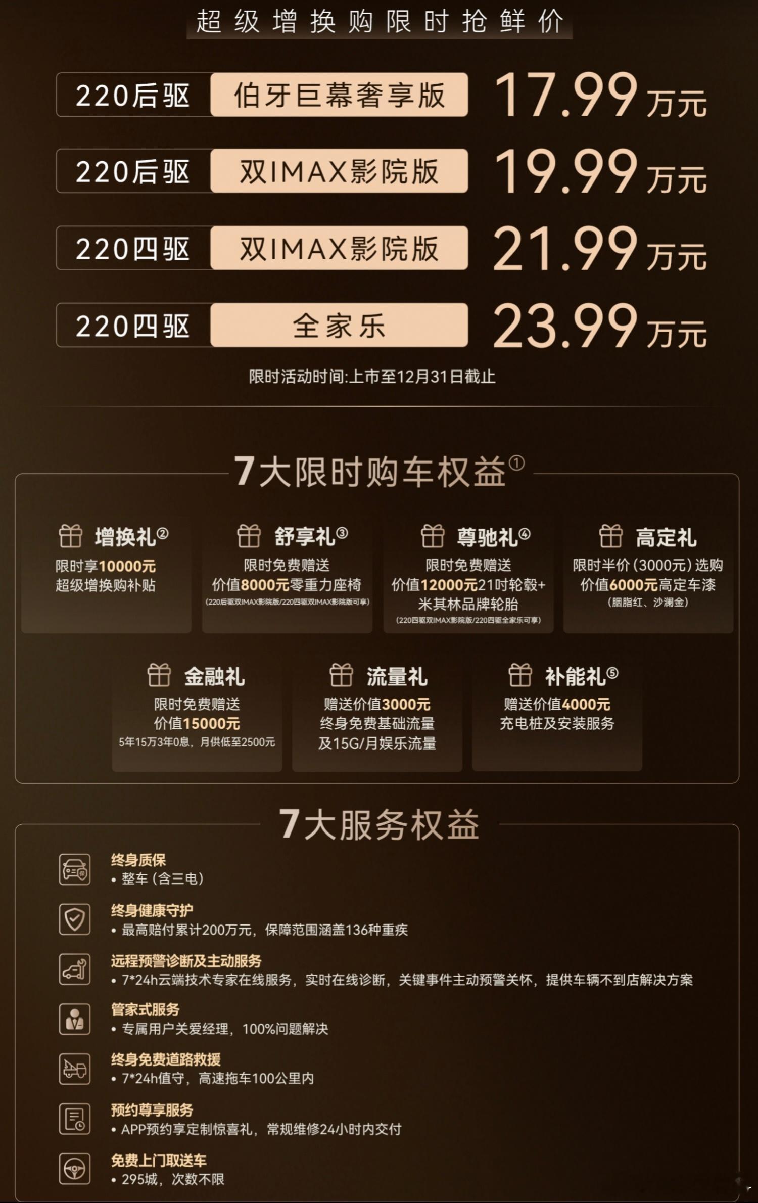 17.99-23.99万元,这是风云t11 的限时置换价,和吉利银河m9 价差不到1万块