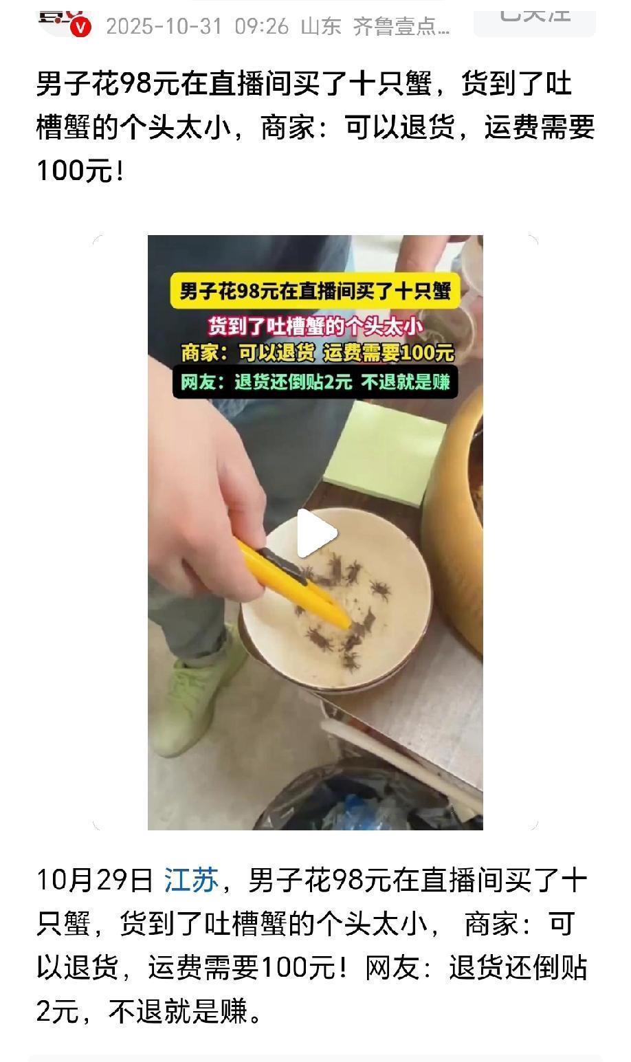 江苏,男子看到直播间卖的螃蟹不错,主播声称是四两的公蟹、三两的母蟹,98元就能到手10只螃蟹,他果断下单购买了10只。心心念念的螃蟹到货后,男子傻眼了,螃蟹个头特别小,还没硬币大,而且还有一只已经死亡。男子想退货,商家也同意七天无理由退货,但运费需要100元,折腾一趟还倒贴不少,男子无奈的笑了。 王先生闲来无事,喜欢看看直播、刷刷短视频打发无聊的时光。没一会,他就被直播间的螃蟹直播勾得挪不开眼。 只见主播拿着肥美的螃蟹在镜头前晃悠,充满激情的吆喝着:家人们福利来了,四两重的大公蟹、三两沉的大母蟹,现在下单98元直接发10只,错过就要再等一年。 王先生平时就爱吃螃蟹,一听这价格和规格,他觉得太划算了。 他知道,市场上一只四两的公蟹就得二三十,10只差不多得两百多,这波羊毛值得薅一把。 王先生越看越上头,主播还亲口承诺每只都保肥保活,收到不满意随时退,直播间里不断滚动的订单和网友的好评,他再也忍不住,果断点了下单。 接下来的几天,王先生天天盼着快递到货,脑子里已经脑补出清蒸螃蟹、香辣蟹的美味,就连做梦都想着掰开蟹壳满是蟹黄蟹膏的样子。 好不容易等来了取件通知,他赶紧一路小跑去快递站,抱着沉甸甸的箱子,心里美滋滋的期待着他的螃蟹。 可拆开箱子的那一刻,王先生脸上的笑容瞬间僵住了。 箱子里的10只螃蟹蜷缩着,个头小得可怜,他随手掏出一枚一元硬币比对,发现螃蟹连壳带腿还没硬币大。 这哪是四两公蟹、三两母蟹啊?分明是螃蟹宝宝。 王先生越看越生气,个头小就罢了,其中还有一只已经硬邦邦的,早就没了生命迹象。 他立刻联系商家客服,质问对方为什么货不对板。 客服倒是回复得挺快,简单的致歉以后,就爽快的告诉王先生,要是不满意,支持七天无理由退货哦。 一听能退货,王先生的心里稍微平复了些,觉得能及时止损。 可看到客服发来的地址,他直接傻了眼,退货地址竟然在西藏。 王先生查了下快递费用,从江苏寄到西藏,寄这箱螃蟹的运费要100元,这笔损失还要他自己承担。 买螃蟹才花了98元,退货运费就要100元,这不是明摆着让人没法退嘛,王先生被商家妥妥的套路了一波。 王先生看着小得可怜的螃蟹,他实在进退两难。不退吧,这螃蟹根本没法吃,退吧,还得再倒贴2块钱,折腾一圈更不划算。 看到王先生的遭遇,网友调侃道:退货倒贴2元,不退就是赚了。 本想在直播间薅个羊毛,结果却被直播间套路,王先生这是典型的贪小便宜吃大亏。 对于王先生的遭遇,他该如何合法的维权呢? 首先,王先生可以举报商家虚假宣传。 《反不正当竞争法》第八条规定,经营者不得对其商品的性能、功能、质量、销售状况、用户评价、曾获荣誉等作虚假或者引人误解的商业宣传,欺骗、误导消费者。 商家通过直播间明确宣称销售的是四两公蟹、三两母蟹,但实际到货的螃蟹还没硬币大,与宣传的重量标准存在根本性差异,显然属于故意传递与商品实际情况不符的信息。 这种行为并非简单的货不对板,而是通过夸大商品规格制造优惠假象,欺骗、误导王先生基于错误认知下单,已构成典型的虚假商业宣传,可以追究商家的行政责任。 其次,商品存在质量问题,退货运费应由商家承担。 《消费者权益保护法》第二十四条规定,经营者提供的商品或者服务不符合质量要求的,消费者有权依照国家规定、当事人约定退货,或者要求经营者履行更换、修理等义务。 依照前款规定进行退货、更换、修理的,经营者应当承担运输等必要费用。 王先生收到的螃蟹不仅个头远未达到宣传标准,无法实现正常食用目的,明显不符合商品应有的质量要求。 这是因商品质量问题引发的退货,运输等必要费用应由经营者承担,而非王先生。 最后,商家行为涉嫌欺诈,王先生可主张三倍赔偿。 《消费者权益保护法》第五十六条规定,经营者提供商品或者服务有欺诈行为的,应当按照消费者的要求增加赔偿其受到的损失,增加赔偿的金额为消费者购买商品的价款或者接受服务的费用的三倍;增加赔偿的金额不足五百元的,为五百元。 商家明知所售螃蟹无法达到四两公蟹、三两母蟹的规格,仍通过直播间夸大宣传,主观上具有欺骗的故意,客观上实施了误导消费者的行为,已构成消费欺诈。 王先生作为受害消费者,不仅有权要求商家退还全部购物款98元,还可主张商家赔偿500元。 因此,王先生并不会倒贴2元,而是要勇敢的拿起法律武器,维护自己的合法权益。