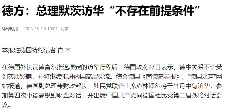 中美初步达成贸易协议,德国立即变脸了! 近期中美贸易谈判取得阶段性进展,这一消息不仅牵动全球经贸神经,更让此前态度强硬的德国迅速调整了对华策略。 9月的时候,在中美新一轮贸易谈判启动前夕,德国外长原本计划对中国进行正式访问。然而其在访问前的公开活动中,就台湾问题发表不当言论,违背一个中国原则这一国际社会公认的外交准则。 中国外交部随后发布声明,以"日程安排调整"为由推迟了此次访问,这一决定清晰传递出中国在核心利益问题上绝不妥协的立场。 当时德国方面对此未作出积极回应,双方外交互动陷入短暂停滞。 进入10月,中美贸易谈判迎来重要突破,双方经过多轮磋商初步达成贸易协议,涉及农产品准入、制造业关税减免、知识产权保护等多个领域。这一成果于10月下旬通过两国官方渠道正式发布,立即引发国际社会广泛关注。 而就在协议消息公布后的第三天,德国联邦政府官网于10月28日发布公告,宣布副总理兼财政部长克林拜尔将于11月15日至17日对中国进行正式访问。 公告中还特别强调,此次访华"不存在前提条件",克林拜尔办公室还同步透露,希望通过此次访问加强中德在经贸、气候变化、数字经济等领域的务实合作,这与此前德国外长的强硬态度形成鲜明对比。 值得注意的是,德国经济界对此次克林拜尔访华表现出高度期待。德国工业联合会主席此前公开表示,中国市场对德国企业具有不可替代的重要性,希望通过高层互访推动解决双边经贸合作中的具体问题。 从中国外交部发布的信息来看,中方将秉持互利共赢原则,与德方就共同关心的议题深入交换意见,推动中德全方位战略伙伴关系持续健康发展。 德国此次态度的快速转变,本质上是基于自身经济利益的务实考量。中国作为全球第二大经济体和重要消费市场,与中国保持良好经贸关系直接关系到德国企业的发展前景和国内就业稳定。 在中美贸易格局发生变化的背景下,德国选择调整对华外交姿态,既是顺应国际经贸合作潮流的必然选择,也反映出当前全球经济环境下各国寻求务实合作的普遍诉求。 这种基于利益的外交调整,也从侧面印证了互利共赢仍是当今国际交往的主流趋势。