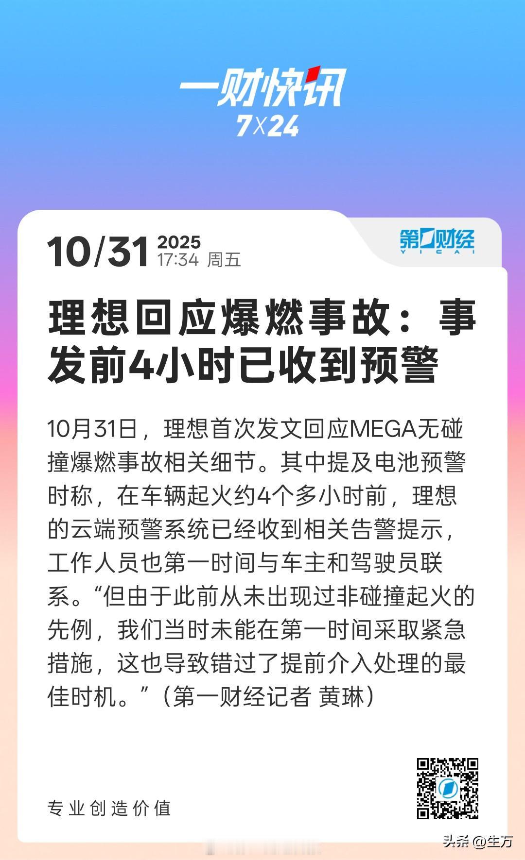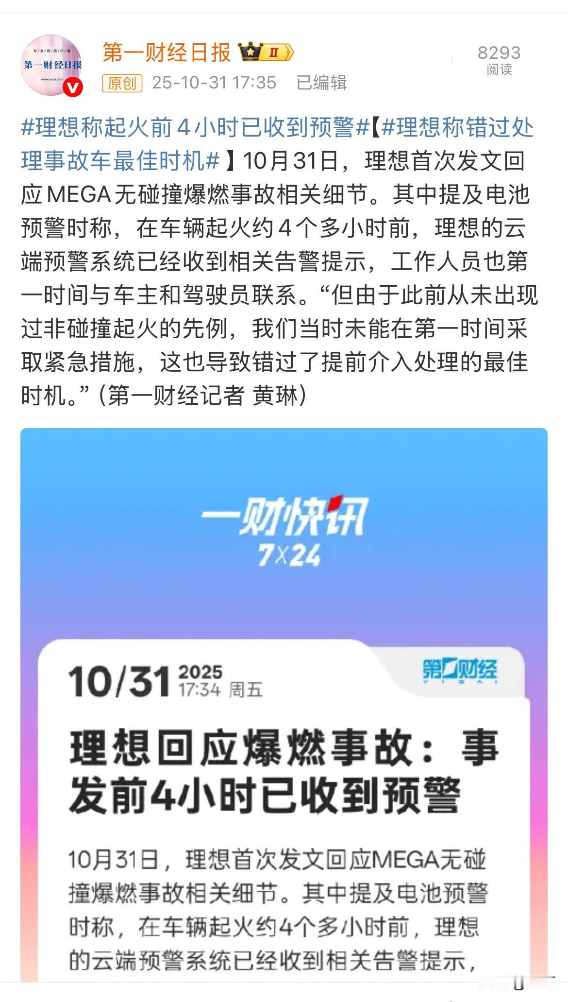 第一财经: 理想称起火前4小时已收到预警! 今天晚上,第一财经专门报道了这个事情的后续! 他们专门联系了理想的工作人员,把这次事故进行了一个大概的还原,简单地说,就是在这个事情发生之前的四个小时就已经收到了预警了! 从理想官方发出来的这篇文章,可以看到,这个事儿发生前的好几个小时,工作人员就已经通过网络的方式发现了这个车有问题! 所以他们及时与这个驾驶员进行了联系,但是不知道为什么这个驾驶人员没有听他们的话,还是继续使用这个车! 这里面,工作人员是怎样与驾驶人员联系的,以及沟通过程当中 ,是否提到这个车电池有问题,或者直接给这个驾驶员说清楚,如果继续使用的话,那么这个车接下来,可能会发生的一系列安全隐患等等,这些比较具体的细节,这个通报上面,并没有详细的说! 目前能够知道的就是到这一步,今天下午他们也发出了一份召回的情况说明。大概是从去年的二月份到十二月份生产的,这部分疑似存在潜在安全隐患的车型,被召回。