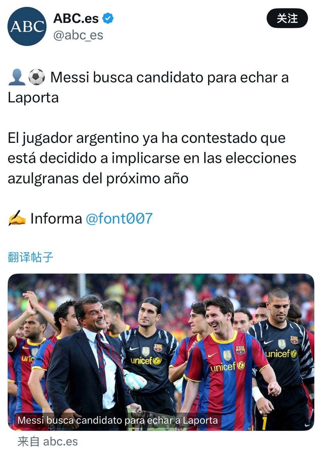 [挖鼻]ABC驻巴塞罗那的记者报道,梅西决定介入巴塞罗那俱乐部即将举行的2026年选举,对抗拉波尔塔。