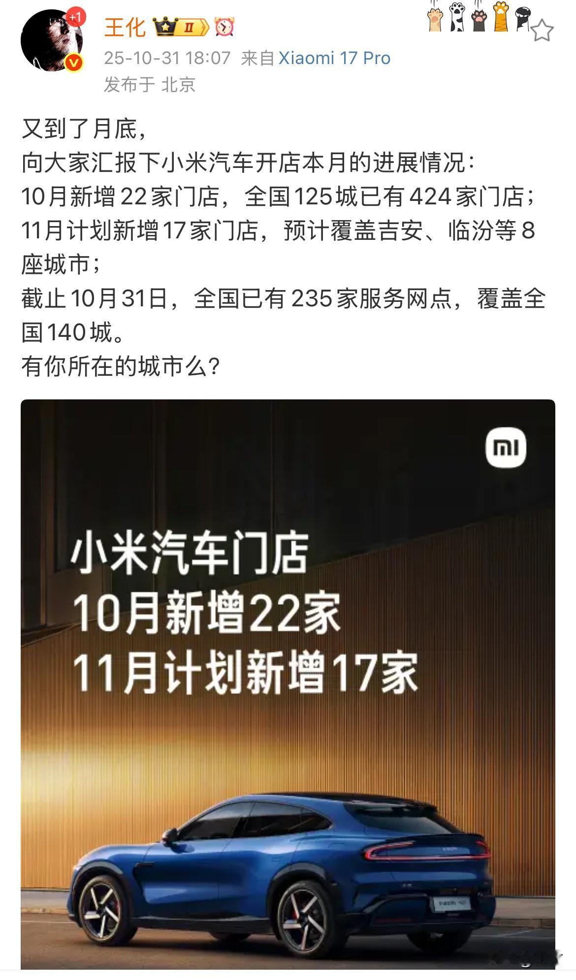 王化:又到了月底,向大家汇报下小米汽车开店本月的进展情况: 没想到小米门店新
