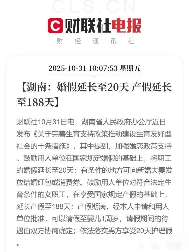 湖南:婚假延长至20天 产假延长至188天。 这样会不会造成更严重的就业歧视?根本原因在于用工成本不同,建议男女产假陪产假一样长。给予更多的育儿补贴。